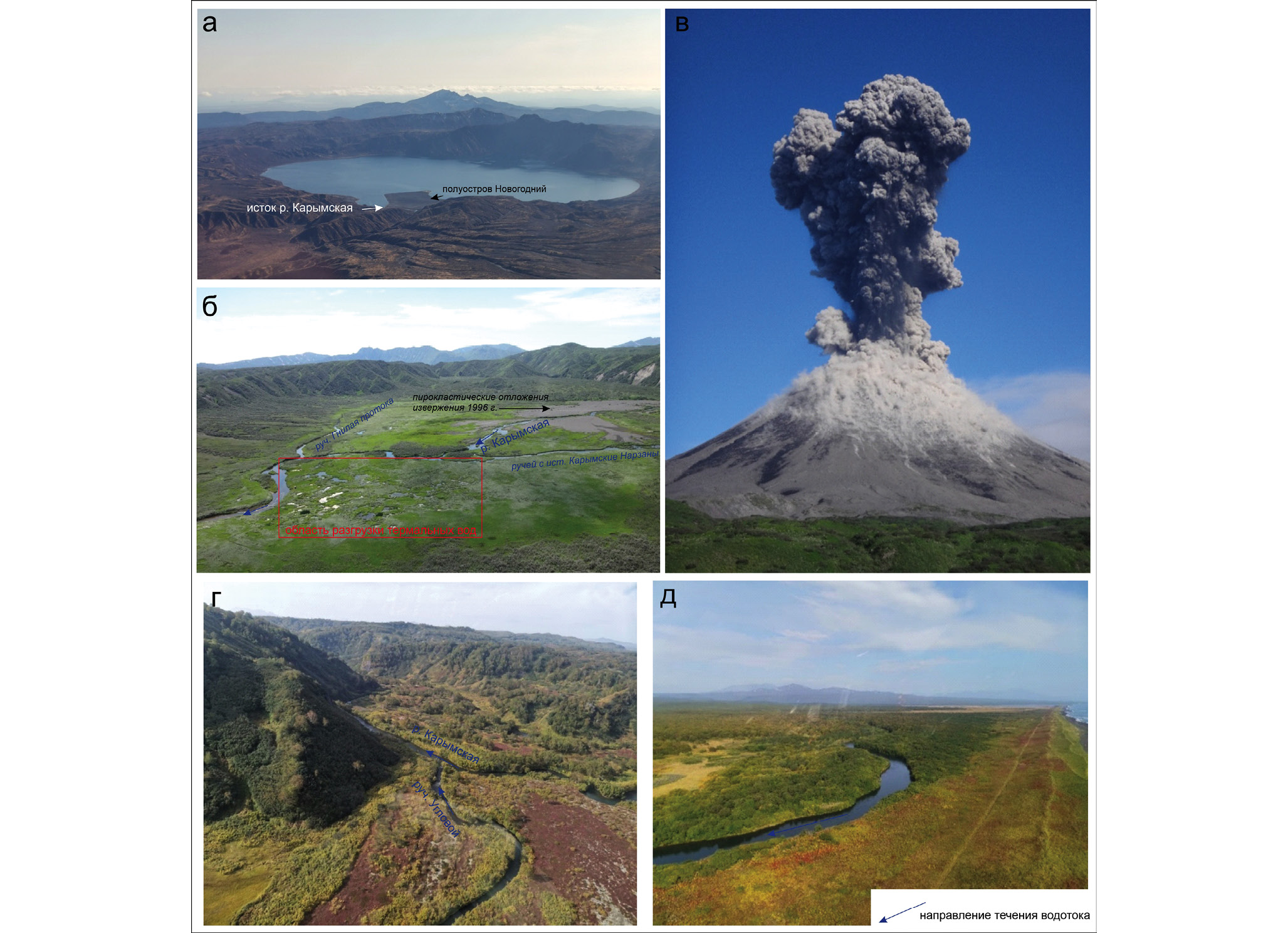 Подводное извержение 1996 г. в кальдере Академии Наук оказало влияние и на кальдеру Карымская. Дважды, сразу после извержения из-за резкого таяния льда на озере и в мае 1996 г. после прорыва перемычки в истоке реки, сформированной продуктами извержения, по р. Карымская до самого устья прошли волны мощного паводка. Огромный объем пирокластического материала был вынесен в “Термальную котловину”, а река на входе в кальдеру изменила русло [Вакин, Пилипенко, 2001]. Новое положение русла сохраняется и в настоящее время. Общий объем термальной разгрузки после извержения не изменился [Вакин, Пилипенко, 1998; Taran et al., 2017]. Весь термальный и холодный грунтовый сток в котловине собирает р. Карымская.