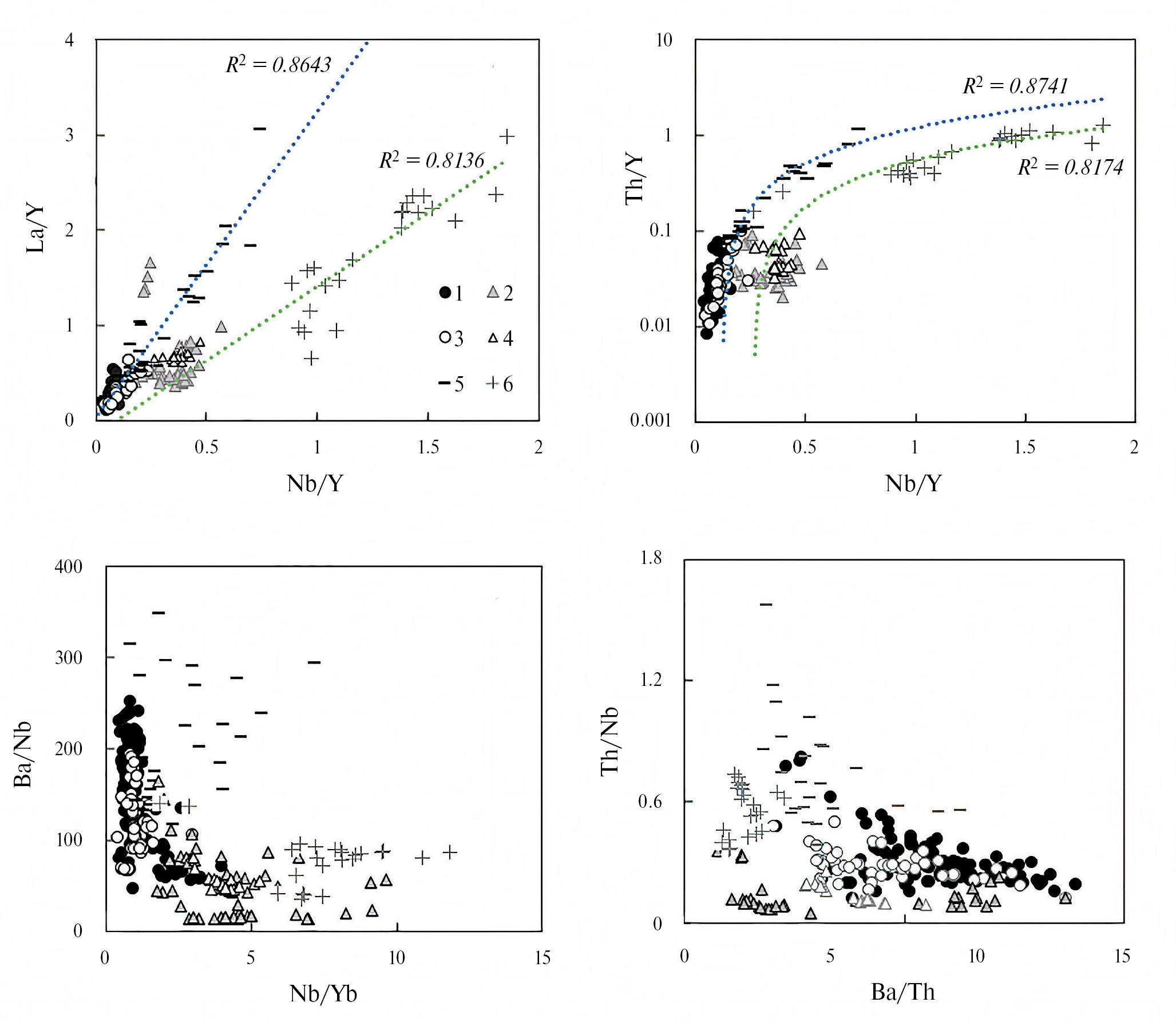 Наиболее удобными для выявления геодинамической принадлежности расплавов могут служить отношения микроэлементов, такие как Nb/Y, La/Y, Th/Y, а также Ba/Nb и Nb/Yb. Различия в величинах этих параметрах накапливаются по мере роста кремнекислотности расплавов.
