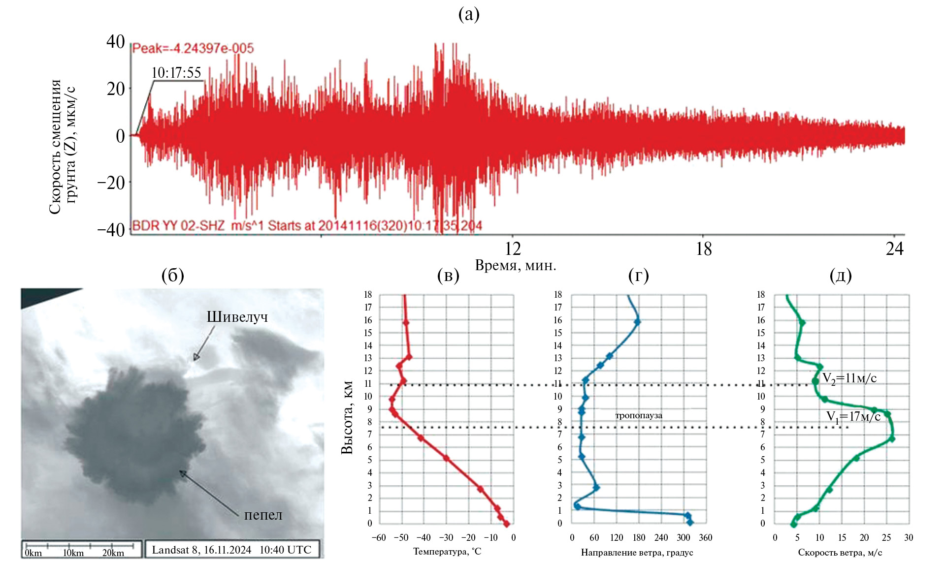 а – вертикальная компонента скорости колебания грунта сейсмического сигнала на BDR, сопровождавшего эксплозивное извержение 16.11.2014 г. вулкана Шивелуч; б – спутниковый снимок (Landsat 8) эруптивного облака эксплозивного извержения вулкана Шивелуч, выполненный в 10:40 16.11.2014 г.; в – данные метеорологической обсерватории “Ключи” на 12:00 16 ноября 2014 г.: стратификация температуры; г – направления ветра; д – скорости ветра.