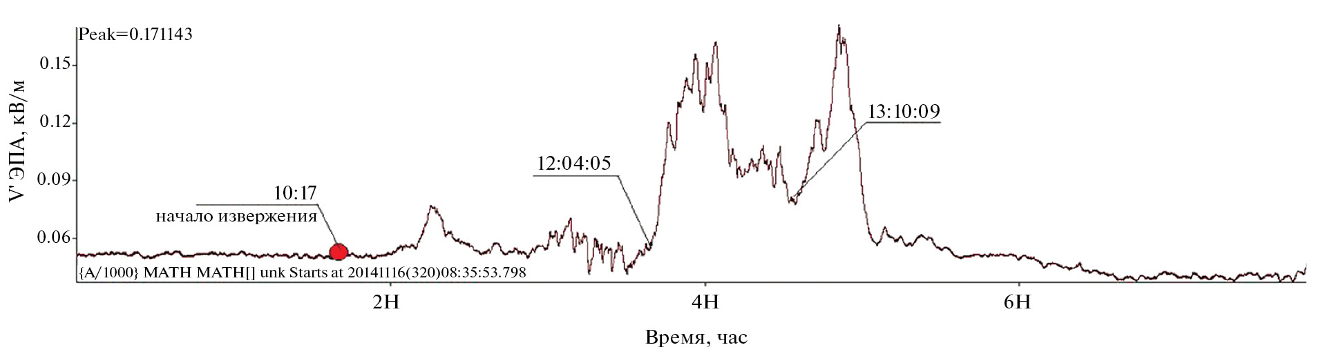 В пункте KZY перед извержением фоновое значение V′ ЭПА было относительно спокойное и составляло >0.06 кВ/м (рис. 3). В 10 ч 45 мин видны первые слабые вариации V′ ЭПА, а почти через два часа после извержения на записи V′ ЭПА выделяются четкие вступления двух аномалий (12 ч 04 мин и 13 ч 10 мин) общей длительностью около 90 мин, когда в максимуме значение V′ ЭПА достигает 0.17 кВ/м. Также видно, что перед хорошо выраженными положительными аномалиями V′ ЭПА в течение 78 мин наблюдаются более “высокочастотные” колебания с амплитудой ~0.01 кВ/м. Сами аномалии также осложнены “высокочастотными” колебаниями. Такая структура сигнала свидетельствует о сложном распределении объемной плотности электростатического заряда в эруптивном облаке, при этом в электростатической структуре эруптивного облака на момент регистрации преобладающим зарядом является положительный.