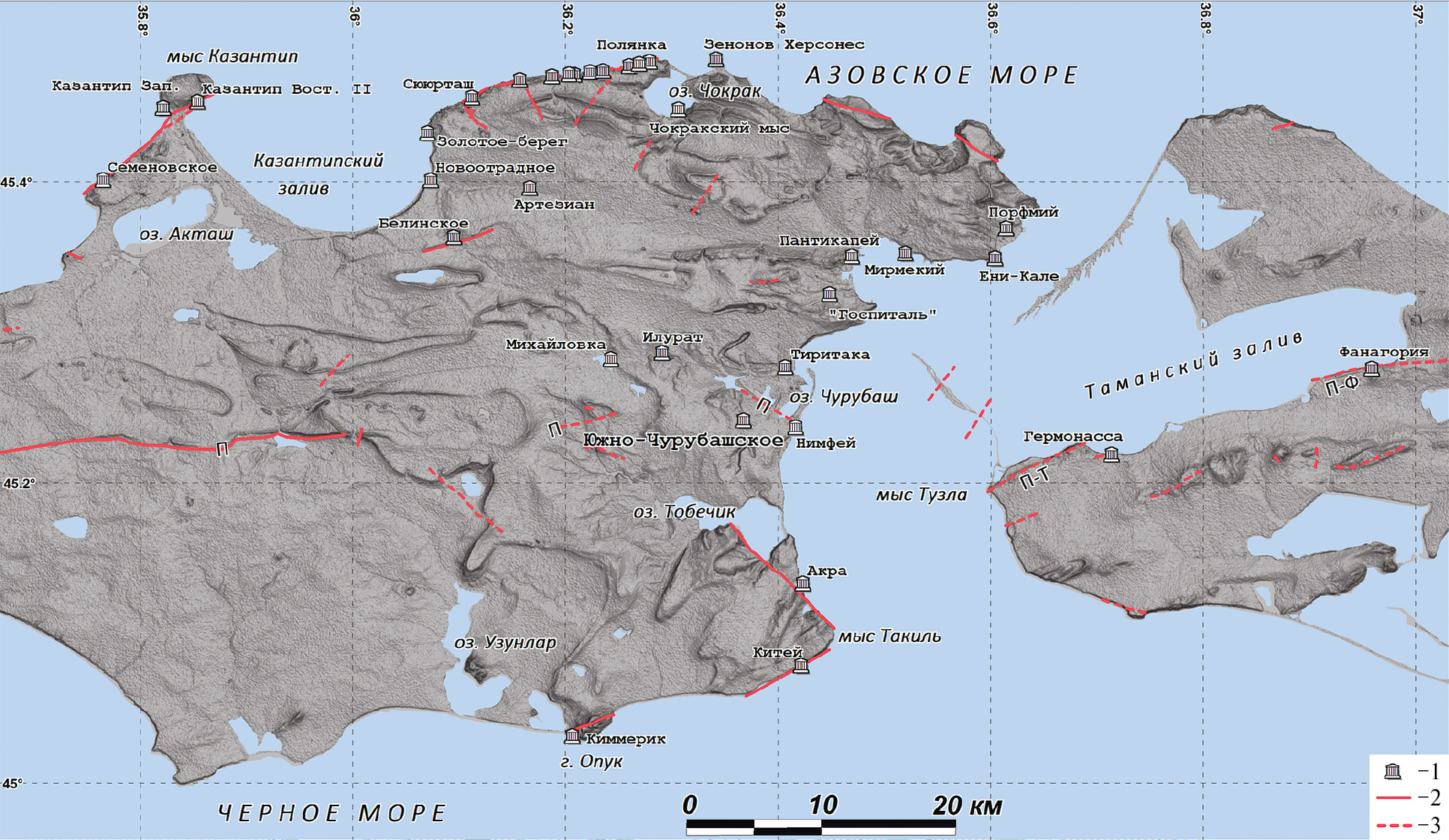 1 – археологические памятники с изученными следами землетрясений; 2 – активные разломы с изученными следами сейсмотектонических смещений в результате выхода очага сильного землетрясения на поверхность; 3 – предполагаемые активные разломы по структурно-геоморфологическим, геофизическим и дистанционным данным. П – сегменты Парпачско-Таманского активного разлома (П-Т, П-Ф – изученные отрезки Тузлинско-Фанагорийской разломно-складчатой зоны).