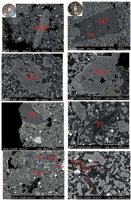 Рис. 3. Структуры основной массы и индикаторные минералы орданшитов (а) и базанитов (б) Капанского неовулканического центра Малого Кавказа в обратно-рассеянных электронах (BSE).