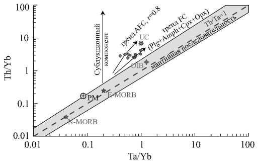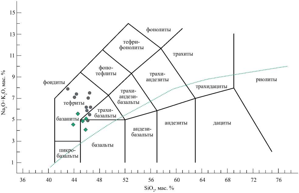 Изученные вулканиты содержат 41.2–45.5 мас. % SiO2, 4.4–7.6 мас. % Na2O + K2O при 0.6–3.1 мас. % K2O; на диаграмме TAS [Le Bas et al., 1986] точки их составов в подавляющем большинстве располагаются в поле базанитов/тефритов (табл. 2, рис. 4). Породы обогащены крупноионными литофильными элементами (LILE) (Ва от 930 до 1550 г/т, Sr от 1850 до 4050 г/т), имеют повышенные содержания S (до 1.99%) и P2O5 (от 0.91 до 1.95%); отношения Nb/Ta в них близки к хондритовым, либо несколько превышают последние (17.8–26.9). Орданшиты региона заметно дифференцированы (0.57–0.63 Mg#), базаниты – близки к составу примитивных расплавов (0.70–0.71 Mg# при Fo89‒90 оливина вкрапленников), равновесных с мантийным источником.