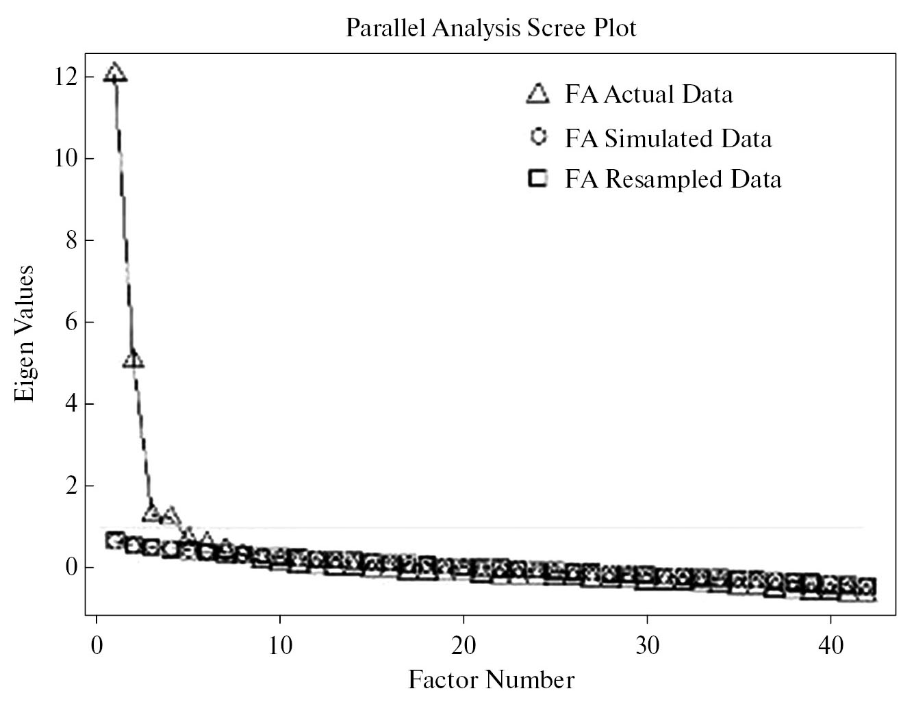 3) результаты анализа графика результатов параллельного факторного анализа (ПФА) и графика “каменистой осыпи” — собственных значений факторов.