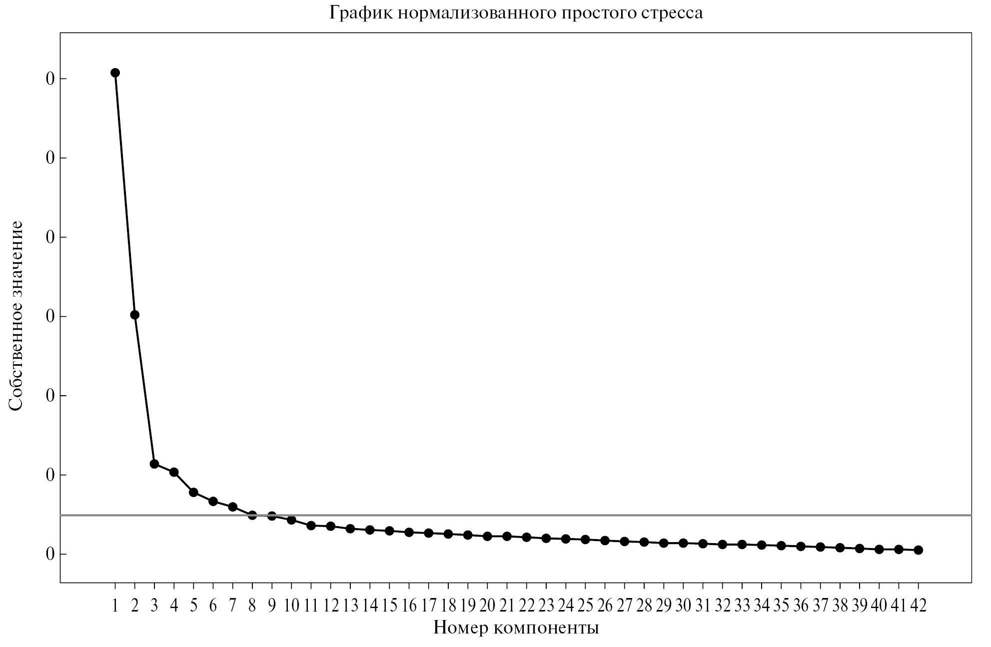 На третьем этапе осуществлен параллельный факторный анализ для определения количества факторов, выделяемых на наших данных (N = 473). Результаты показали выделение 7 факторов и 4 компонентов (см. приложение 3, рис. 1).