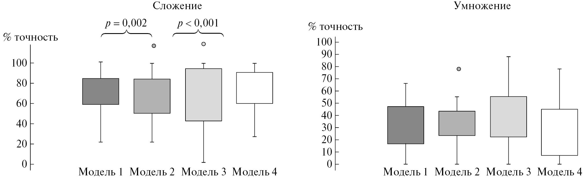 В. Точность (precision) как процент верно спрогнозированных моделями NC представлена на рис. 4 и в табл. 2. По критерию Краскела—Уоллиса обнаружены значимые различия между моделями на Сложении: c2(3) = 18.8, p < 0.001, размер эффекта h2 = 0.1, мощность критерия power = 0.93. По тесту Dunn—Sidak correction test a = 0.0085 обнаружены значимые различия между Моделями 1 и 2 (p = 0.002) и Моделями 2 и 3 (p < 0.001). Значимых различий между моделями на данных Умножения не обнаружено: c2(3) = 6.52, p = 0.089, размер эффекта h2 = 0.023, мощность критерия power = 0.93.
