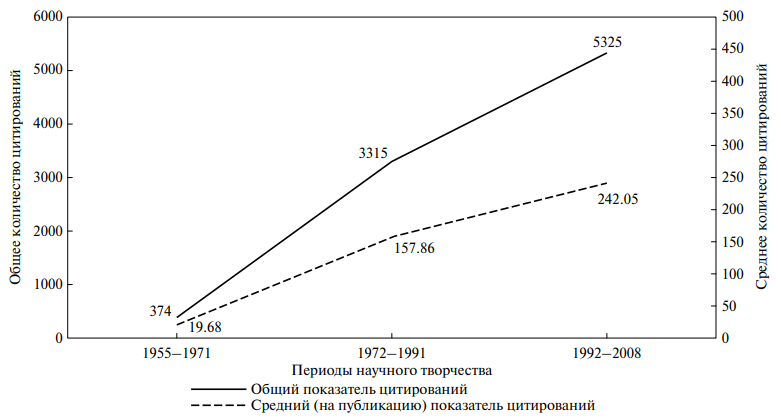 Обозначим факторы, которые могли повлиять на распределение цитирований во времени: с логико-научной точки зрения, повышалось научное признание идей Л.И. Анцыферовой в целом и ее последних достижений в частности; с личностной — коллеги и ученики активно обращались к ее трудам; с научно-организационной — после ее смерти отмечались памятные даты, была организована юбилейная конференция в 2019 г. [20]; с социально-исторической — на увеличение показателей влияло общее развитие баз данных и стимулирование публикационной активности в стране.