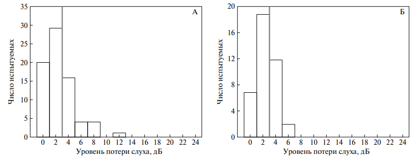 Рис. 4. Распределение межушной разницы в порогах слышимости, усредненной по 4-октавным частотам речевого диапазона (500, 1000, 2000 и 4000 Гц) в двух группах испытуемых: А — группа молодого возраста; Б — группа среднего и пожилого возраста. Вертикальной линией показана средняя по группе разница