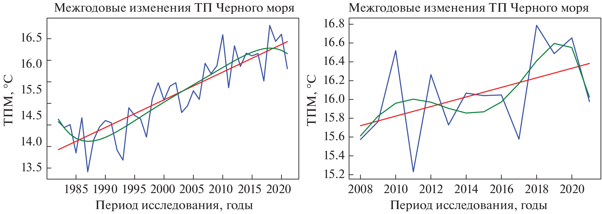 Based on the analysis of satellite data from 1982 to 2021 with a spatial resolution of about 0.05° × 0.05°, the total increase in the Black Sea surface temperature was confirmed. Annual temperature averaged over the entire Black Sea rises with the rate of about 0.6°C/10 years. The annual temperature increment due to the linear trend is at a maximum in May–June. In these months of the hydrological spring, the rate of increase in sea surface temperature (SST) is about one and a half times greater than in October–November. For most of the year, the general warming of the surface water layer is not accompanied by a significant increase in the intra-monthly SST variance. Such an increase is observed only in some months of the transition seasons, especially during the hydrological spring, when the absolute magnitude of extreme thermal anomalies and their area significantly increases. The maximum amplitudes of interannual variations of SST are confined to the northwestern part of the Black Sea. Changes in atmospheric pressure and wind fields significantly impact on the spatiotemporal SST structure of the. Long-term trends of driving pressure above the Black Sea indicate an intensification of regional cyclonic activity in the atmosphere (especially pronounced since 2009), which leads to increased generation of the negative SST anomalies of significant amplitude. Such anomalies occur mainly in the warm half-year (especially in May and October) due to the development of wind-driven upwelling. The May and October negative SST anomalies from the range of –(6–5)°C are characterized by maximum areas. Warm anomalies are also most often recorded in May and (to a lesser extent) in October. They are generated by abnormal heat fluxes on the sea surface, including in shallow areas of the shelf and spread to open areas of the Black Sea due to horizontal advection of mainly wind origin. The described patterns of spatio-temporal SST variability and their causes are illustrated by a case-study of extreme thermal anomalies using comprehensive analysis of wind and SST fields of high spatial resolution.