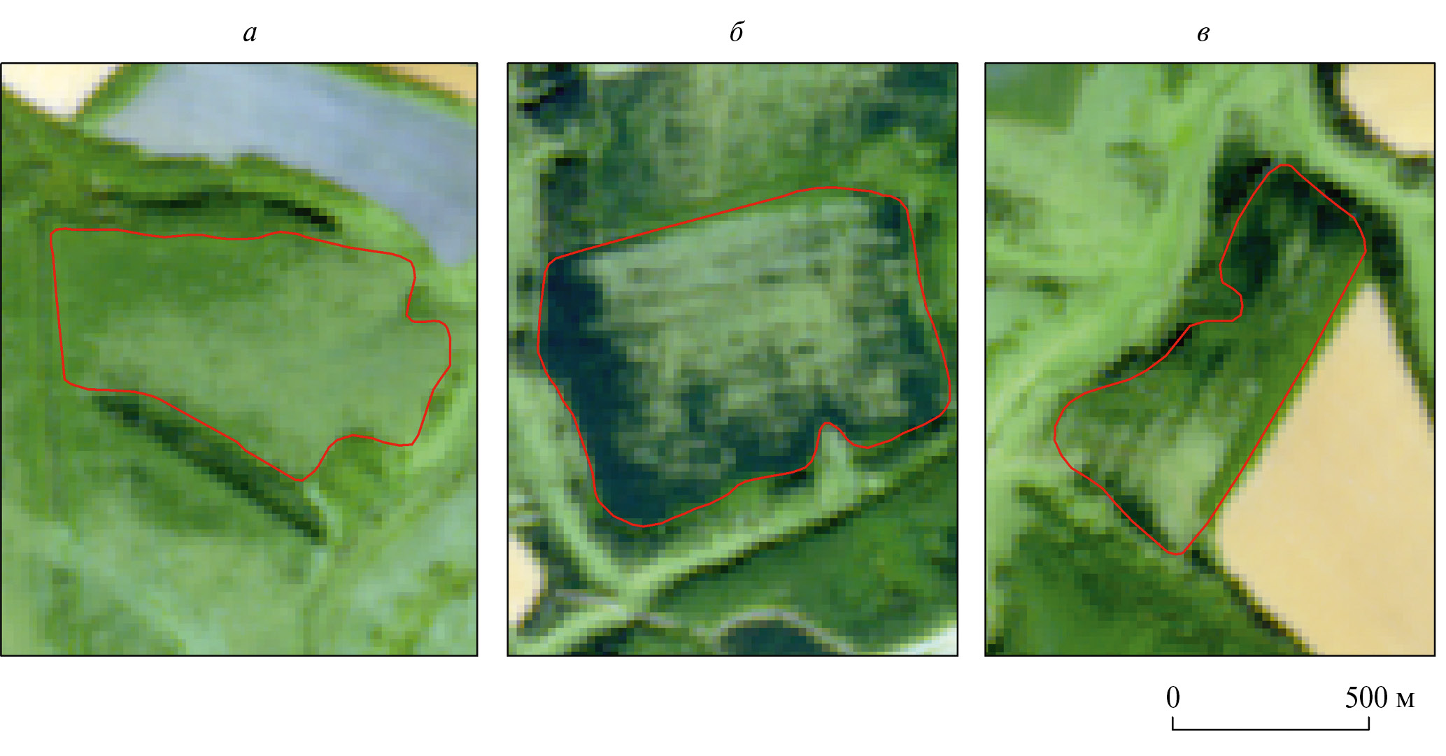 Рис. 5. Примеры залежных земель Среднерусской лесостепи с лиственными (а), хвойными (б) и (в) смешанными насаждениями на снимках Sentinel‑2 от 25.08.2018. Синтез каналов 12–11–34 (SWIR2 – SWIR1 – RED).