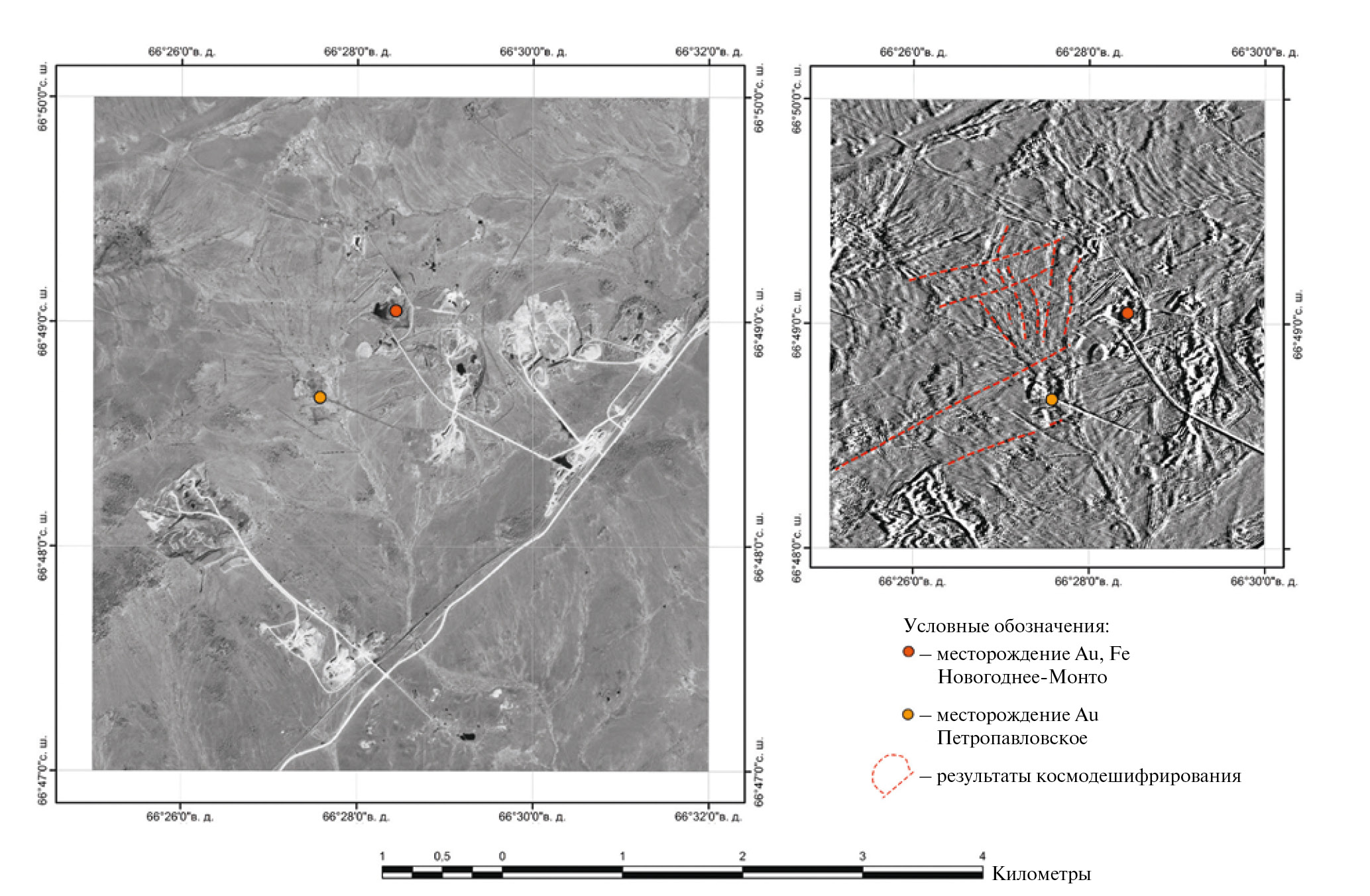Детализация Новогодненской площади (рис. 5) с месторождениями Новогоднее-Монто и Петропавловское позволяет рассматривать Тоупугольский разлом как дуговую структуру, ограничивающую с запада выявленную при космодешифрировании Петропавловскую кольцевую структуру, в пределах которой расположено Новогодненское рудное поле.