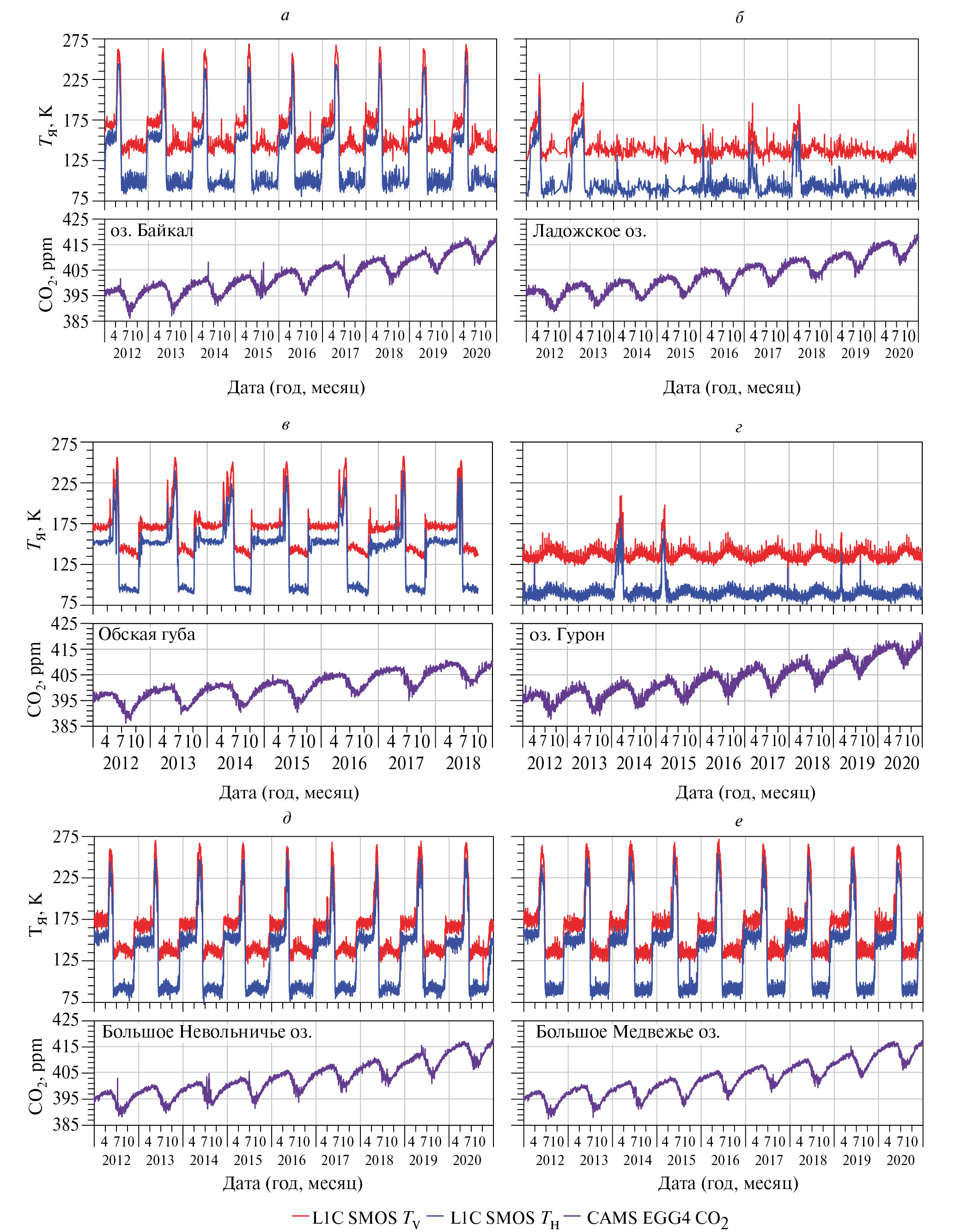Для постоянно замерзающих акваторий максимум концентрации CO2 над ними соответствует периоду разрушения ледяного покрова (сильное возрастание яркостной температуры весной), приводящего к высвобождению накопленного за зимний период углекислого газа, который был “запечатан” во льду и в водной толще подо льдом (см. рис. 4а, в, д, е). Такая же динамика характерна и для редко полностью замерзающих водоемов: Ладожское оз. в 2012, 2013 и 2016–2018 гг. (см. рис. 4б); оз. Гурон в 2014 и 2015 гг. (см. рис. 4г). У замерзающих озер, находящихся в бореальной зоне, помимо стабильного весеннего максимума CO2 иногда наблюдается сильный кратковременный выброс углекислого газа, также соответствующий стадии разрушения ледяного покрова: для оз. Байкал в 2012, 2014, 2015, 2017 и 2019 гг. (см. рис. 4а); для Большого Невольничьего оз. в 2012, 2014, 2015 и 2019 гг. (см. рис. 4д).