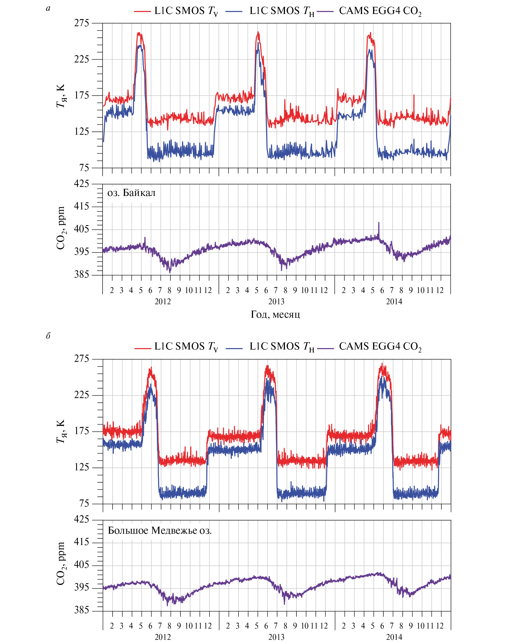 На рис. 5 показана сезонная динамика яркостной температуры и концентрации CO2 для двух озер в более хорошем разрешении за период 2012–2014 гг. На этом рисунке представлены два характерных для бореальной и субарктической зоны озера: Байкал и Большое Медвежье, соответственно. Из рис. 5 видно, что кратковременный выброс углекислого газа у оз. Байкал (см. рис. 5а) соответствует стадии окончания разрушения льда на озере (2012 и 2014 гг.). У Большого Медвежьего озера, расположенного в субарктической зоне, такого выброса не наблюдается (см. рис. 5б). Такой характерный выброс объясняется более высокой биопродуктивностью водоемов бореальной зоны по сравнению с акваториями субарктической зоны и, соответственно, большим накоплением углекислого газа в водной толще за период ледостава. Отсутствие таких выбросов в некоторые годы у замерзающих озер бореальной зоны требует дальнейшего исследования. Вероятно, оно связано с какими-то гидрологическими и биохимическими процессами, происходящими в этих акваториях.