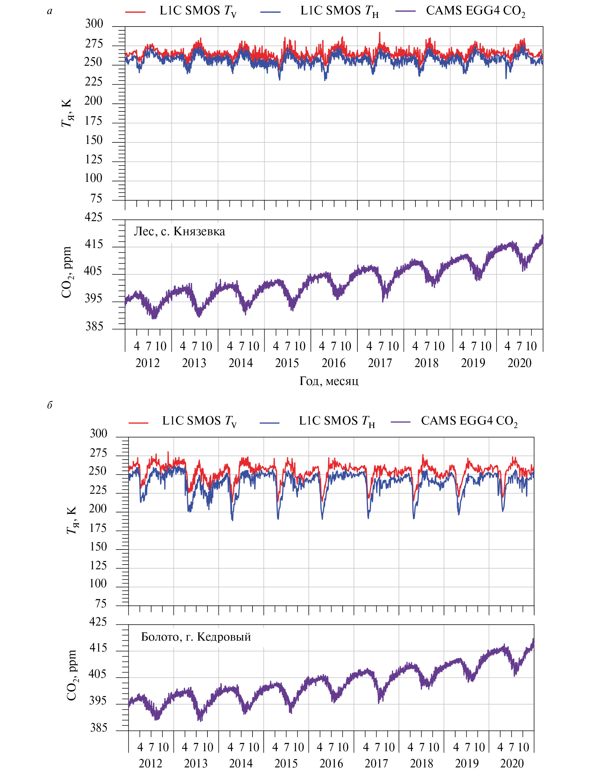 На рис. 4 представлена динамика яркостной температуры выбранных ячеек (продукт L1C SMOS) для исследуемых акваторий (см. рис. 2) и динамика содержания CO2 над ними, полученная по данным CAMS EGG4, за 2012–2020 гг. (для Обской губы за 2012–2018 гг.).
