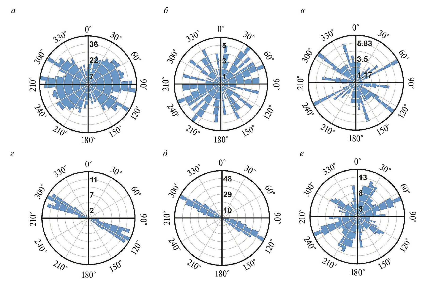Рис. 7. Ориентировки: а – крупных линеаментов, б – средних линеаментов, в – мелких линеаментов, г – рудных тел, д – зон березитизации с кварцевыми прожилками, е – линеаментов регионального масштаба.