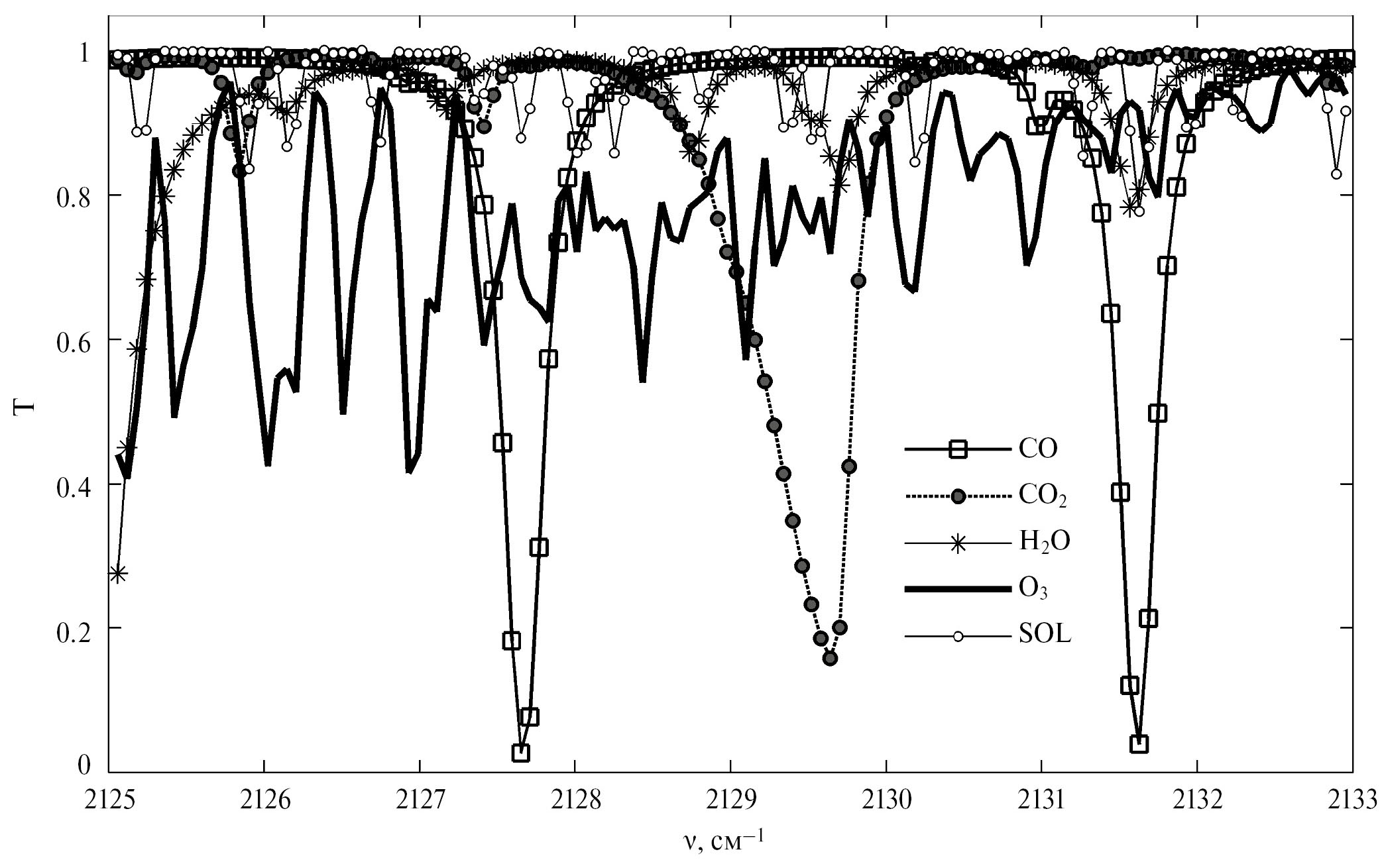Расчет вклада различных газов в спектр пропускания солнечного излучения в интервале 2125–2133 см–1 на примере спектра, соответствующего минимуму в сезонном ходе ОСО, показан на рис. 1. В расчете учитывались также солнечные (фраунгоферовы) линии (SOL).