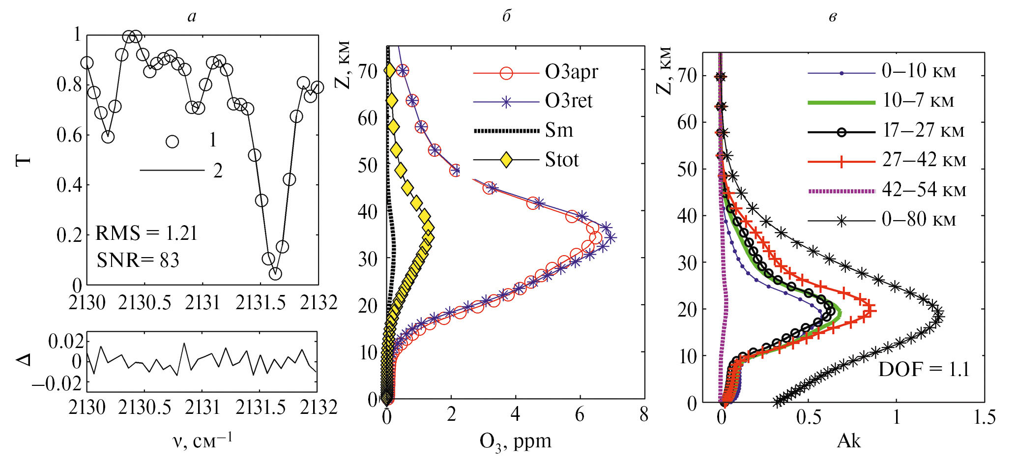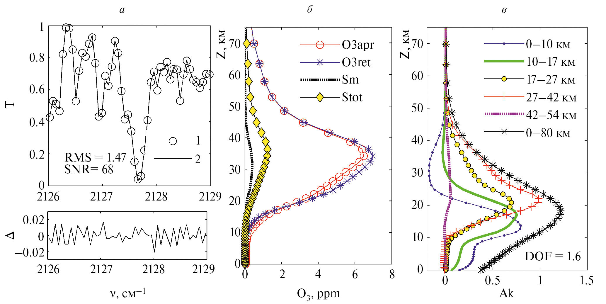 Рис. 2. Пример восстановления вертикального профиля озона в интервале 2126–2129 см−1: а – измеренный (1) и рассчитанный (2) спектры и разность ∆ между расчетом и измерениями; б – априорный (O3apr) и восстановленный (O3ret) профили, Sm – измерительная и Stot – полная случайные погрешности; в – усредняющие ядра (Ak) для различных слоев.
