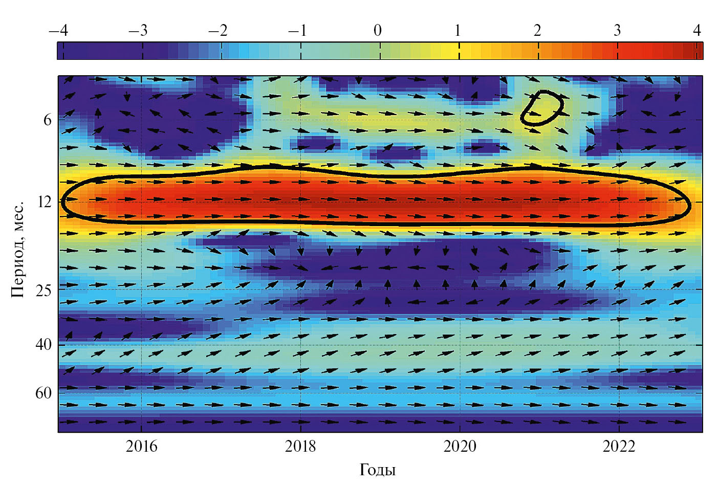 Рис. 6. Кросс-корреляционная вейвлетограмма среднемесячных значений ОСО по данным ст. Обнинск и OMPS. Цветовая шкала в отн. ед. Значения, превышающие доверительный интервал 95%, выделены жирной линией. Направления стрелок вправо соответствуют синхронности колебаний.