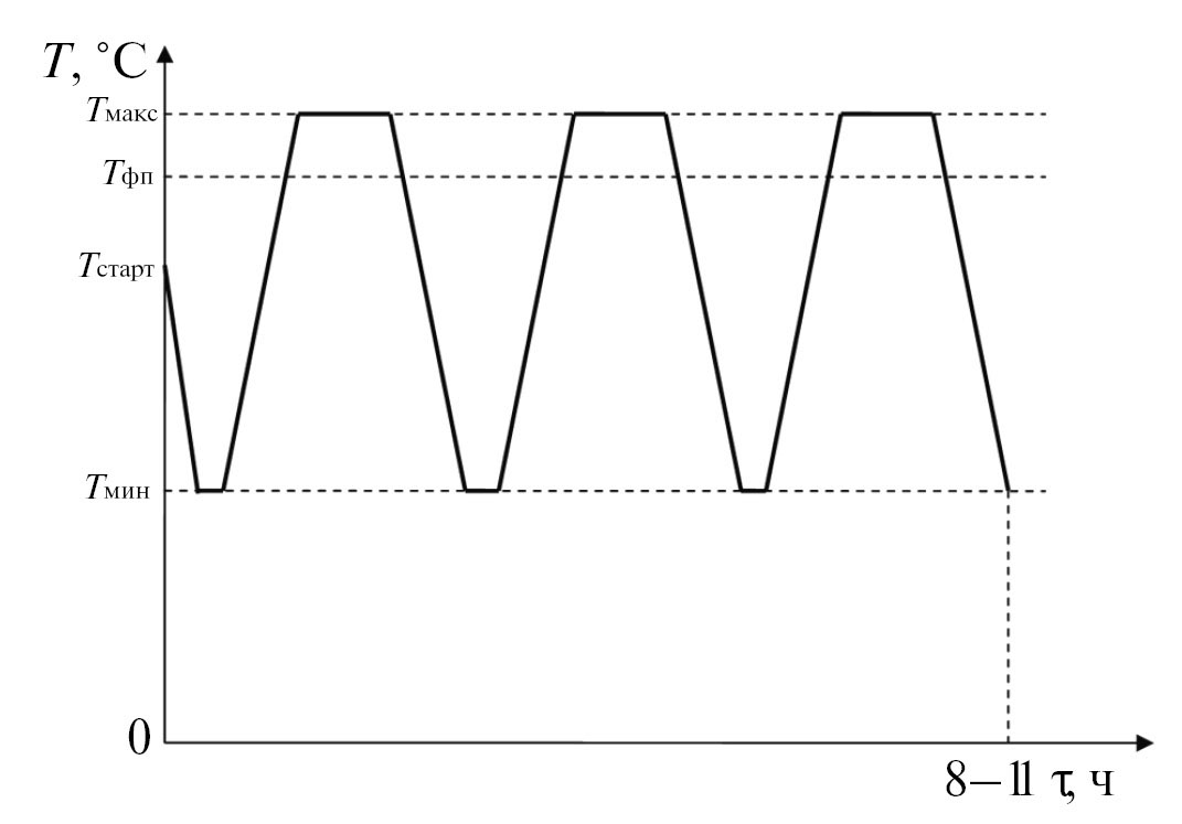 Циклограммы для разных ТБ отличаются, в зависимости от температуры фазового перехода Тфп вещества в ТБ, только величинами Тмакс и Тмин. Стартовая температура Тстарт – близкая к температуре окружающей среды – может быть как выше, так и ниже Тфп того или иного вещества (на рис. 2 представлен второй случай). По этой причине все серии КЭ начинаются с охлаждения (рис. 2), чтобы в начале первого цикла плавления – кристаллизации вещество гарантированно находилось в твердом состоянии.