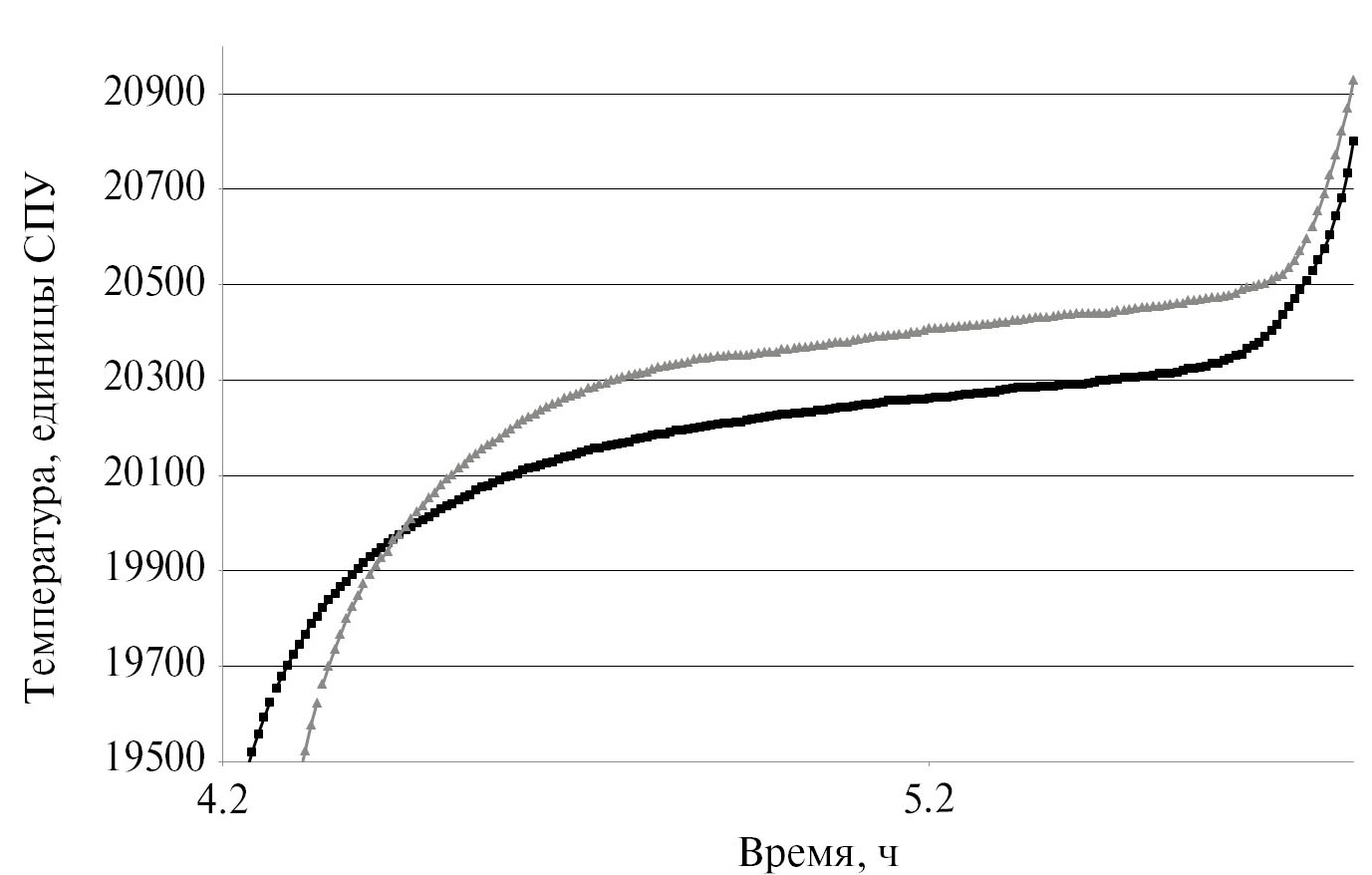 Шкала по оси температур на рис. 3 указана в единицах СПУ, соответствующих данным с выхода аналого-цифрового преобразователя в СПУ, на вход которого поступают сигналы с датчиков температуры А и Б. В КЭ “Репер-Калибр” не ставилась задача измерения абсолютных значений температуры образцов, в том числе – абсолютных значений реперных точек, исследуемых в КЭ. Эксперимент был направлен на исследование формы и повторяемости реперных плато плавления в сериях КЭ, а также ‒ возможного влияния невесомости на форму, повторяемость и относительное положение плато.