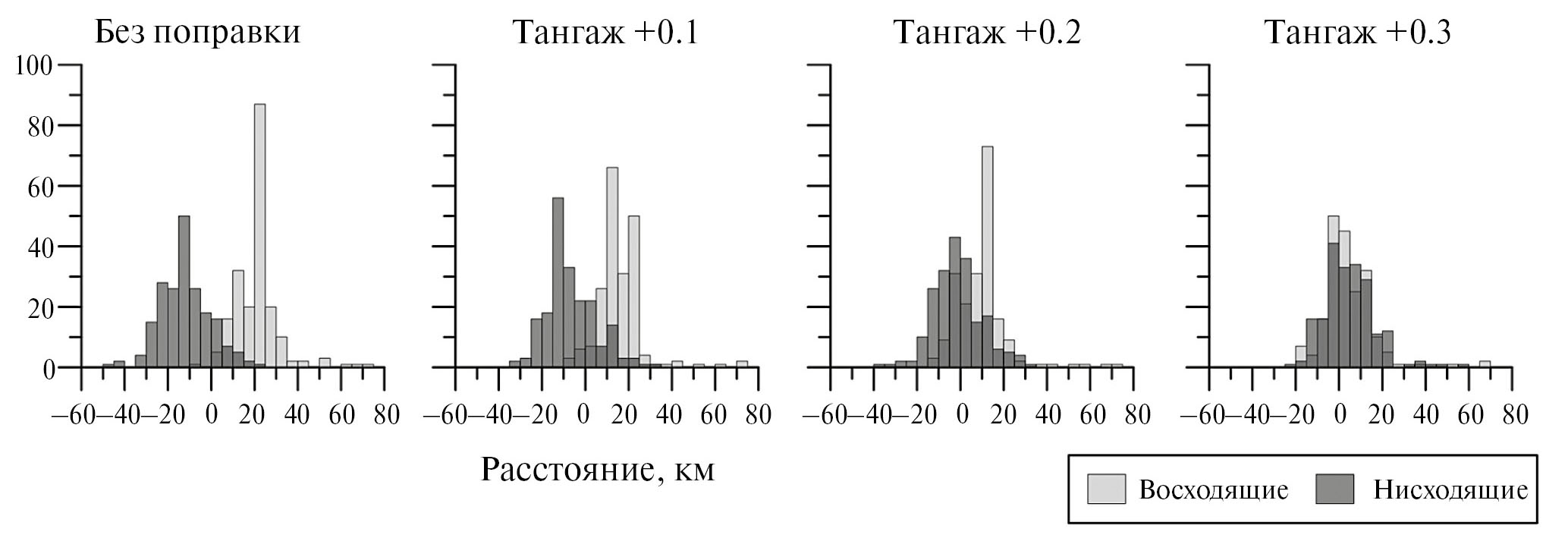 Описанный в предыдущем разделе алгоритм поиска корректирующих углов крена, тангажа и рыскания применялся при обработке данных измерений МТВЗА-ГЯ, полученных с этого прибора за 2020 год. Данные измерений, прошедшие первичную обработку до уровня L1B (с использованием программного комплекса предварительной обработки измерений МТВЗА-ГЯ) были предоставлены для анализа сотрудниками АО “Российские космические системы” (РКС). После сортировки (включающей выбраковывание ошибочных и неполных данных), выполняемой в автоматическом режиме комплексом предварительной обработки, набор данных составил 281 сутки измерений. Из этого массива суммарно было выделено 3448 областей осадков для восходящих витков и 4166 для нисходящих витков.