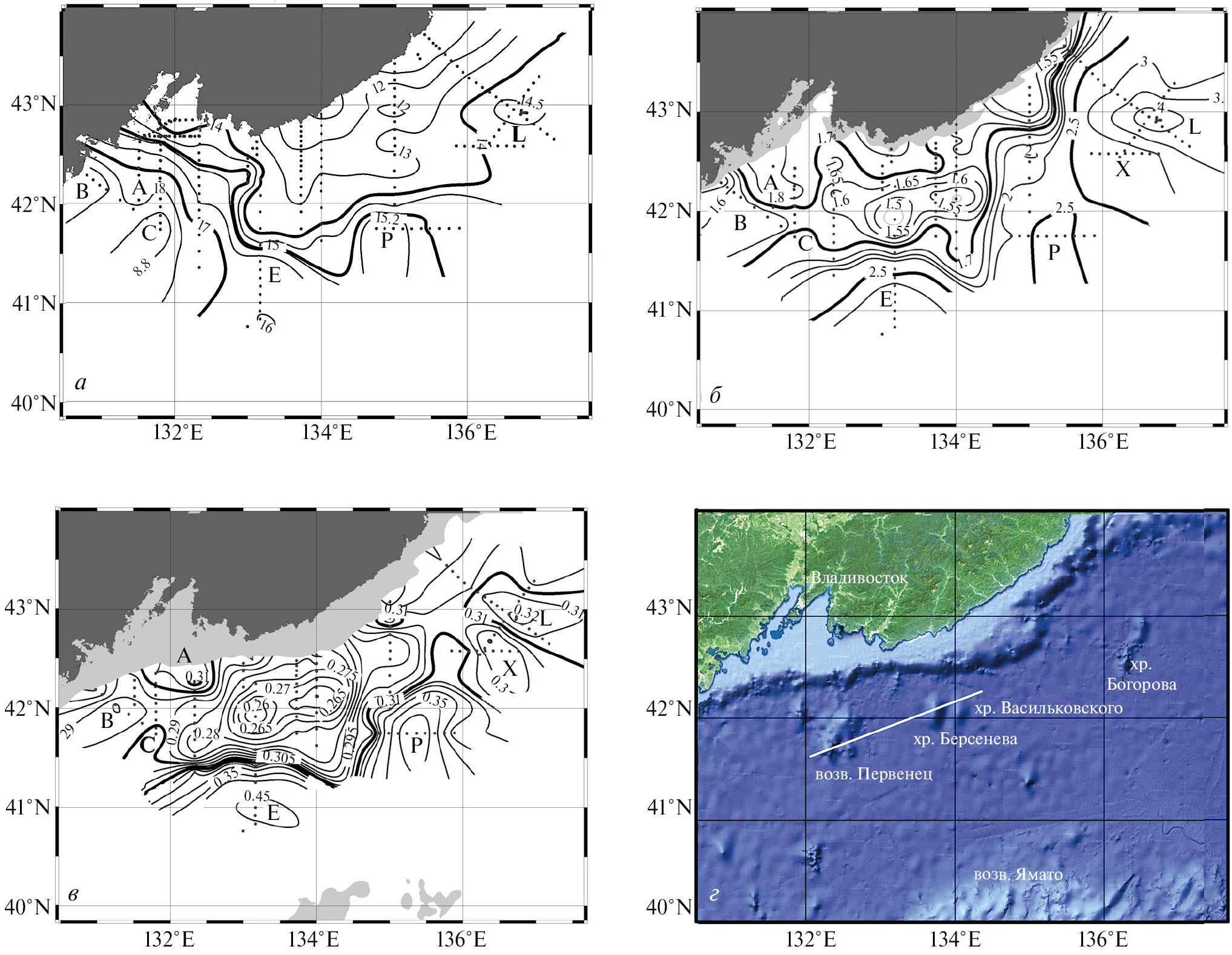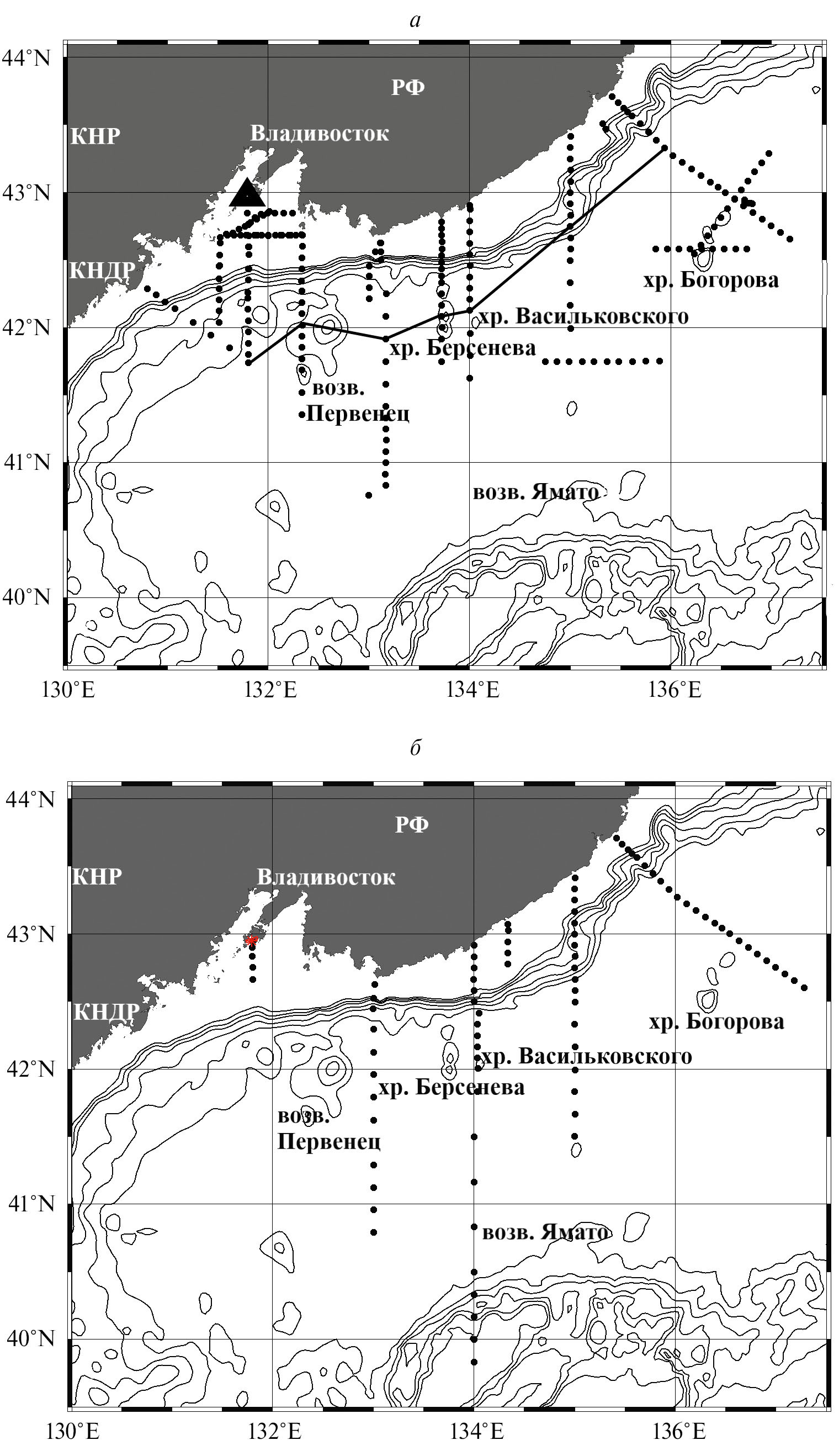 Использование спутниковых снимков в ИК-диапазоне при исследовании северной половины Японского моря позволило существенно развить представления о структуре и динамике фронтов, течений, синоптических вихрей и прибрежного апвеллинга (Жабин и др., 1993; Юрасов, 1995; Лобанов и др., 2007; Никитин и др., 2009; Никитин А.А., Юрасов Г.И., 2017). Это стало возможным благодаря особенности спутникового метода ‒ одновременно и многократно в течение суток для всей акватории моря получать снимки с детальным распределением температуры поверхности моря (ТПМ), наблюдать возникновение и эволюцию разномасштабных термических структур. Две такие структуры, наиболее отчетливо проявляющиеся на спутниковых снимках ежегодно в осенне-зимний период, наблюдаются в крупномасшабном циклоническом круговороте (КЦК). На спутниковых ИК-изображениях, полученных на сайте http://www.satellite.dvo.ru и приведенных на рис. 2, видно, что и в осенне-зимние месяцы 2019 и 2021 гг. (данные экспедиций этих лет используются в настоящем исследовании) в северной половине моря сформированы две крупномасштабные области пониженной температуры, разделенных затоком теплых цусимских вод со стороны о. Хоккайдо. Юго-западная область примерно расположена по долготе между 130°–135° в.д., по широте ‒ от побережья до субарктического фронта на 40° с.ш., северо-восточная – между 135°–139° в.д. и 43°–46° с.ш. Со сменой летнего муссона на зимний и возникновении осеннего ветрового прибрежного апвеллинга (Гончаренко и др., 1993; Жабин и др., 1993; Юрасов, 1995) создаются условия для быстрого понижения ТПМ на обширной акватории за счет перемешивания в верхнем слое моря с усилением сгонных ветров, сезонным снижением температуры воздуха и выноса холодных трансформированных апвеллинговых вод от побережья. Одним из факторов, приводящих к формированию двух термических областей, кроме выше перечисленных, может быть недостаточно на данный момент изученное явление ‒ подъем глубинных вод (глубинный апвеллинг открытого моря), наблюдаемый в течение года в северной половине Японского моря в области КЦК, который идентифицируется на разрезах по куполообразной конфигурации изолиний гидрологических и гидрохимических параметров (Леонов, 1960; Мокиевская, 1961; Панфилова, 1961; Покудов и др., 1976; Юрасов, Яричин, 1991; Talley et al., 2004). Причиной глубинного апвеллинга, кроме циклонической циркуляции (Баталин, 1958; Истошин, 1960; Степанов, 1961; Васильев, Макашин, 1991; Ванин, 2004), могут быть такие процессы, как компенсационный подъем вод вследствие зимней присклоновой конвекции (Леонов, 1948; Степанов, 1961; Яричин, Покудов, 1982), опускание в южных и юго-восточных районах моря из-за уплотнения при смешении япономорских холодных и теплых субтропических вод во фронтальных разделах и развитие антициклонических вихревых образований (Яричин, Покудов, 1982; Юрасов, Яричин,1991). В 1999–2002 гг. с помощью буев, дрейфующих на глубине 800 м, было установлено, что характер глубинной крупномасштабной циркуляции в области Японской котловины в целом тот же, что и в поверхностном слое, причем глубинные воды охвачены циклоническим движением в течение всего года. Кроме того, было выявлено, что в пределах КЦК, в его западной и восточной частях расположены две области циклонической активности меньшего масштаба – западный и восточный циклонические круговороты (ЗЦК и ВЦК) (Данченков и др., 2005), с которыми н
