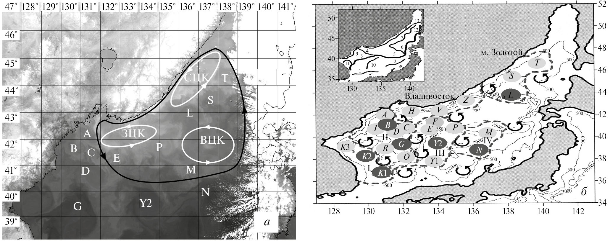 Рис. 9. а – изображение северной половины Японского моря в ИК-диапазоне со спутника NOAA за 9 октября 2019 г. Латинскими буквами на рисунке обозначены антициклонические вихревые образования; черной линией оконтурена область КЦК; белыми линиями ‒ циклонические круговороты: западный (ЗЦК), восточный (ВЦК) и северный (СЦК). б – рисунок из (Никитин, Юрасов, 2008). Латинскими буквами на рисунке обозначены антициклоны, установленные по спутниковым данным за 1988–1996 гг. Затемненными кружками обозначены квазистационарные антициклоны. На вставке – обобщенная схема поверхностных термических фронтов в Японском море.