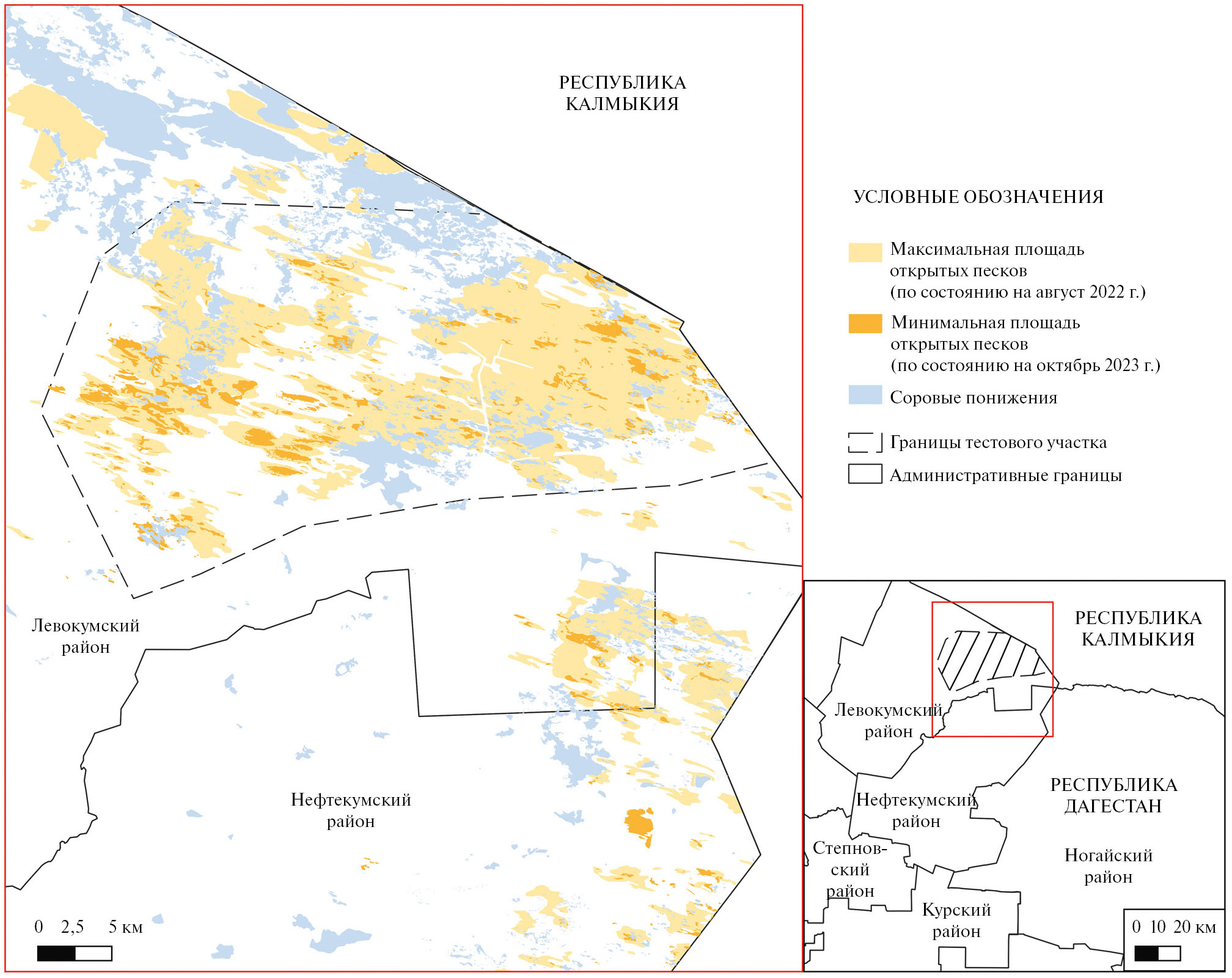 Северо-восток Ставропольского края с начала XXI века подвержен значительному росту опустыненных территорий, усугубившемуся после 2017 года в связи с изменением климатических условий – учащением и интенсификацией пыльных бурь на всей Прикаспийской низменности (Антонов, 2018, Мелихова, 2023; Юферев и др., 2022; Gontovaya, 2021). Похожие ситуации регулярно наблюдаются также на восточном побережье Каспийского моря – в Атырауской области Казахстана (Ершибулов, 2016). Выявление зависимостей между площадями открытых песков и климатическими условиями является основой прогнозирования их динамики, расчет которой необходим для планирования лесомелиоративных мероприятий, направленных на закрепление подвижных песков и формирование пастбищных угодий на песках для их возвращения в сельскохозяйственный оборот (Лапенко, Хонина, 2022; Саидов и др., 2021). Особенностью протекающих на территории Левокумского и Нефтекумского районов (северо-восток Ставрополья) процессов опустынивания является то, что, несмотря на большое количество исследований, посвященных опустыниванию и изучению динамики площадей открытых песков в пределах Терско-Кумской низменности, как правило, они ограничены административными границами Республик Калмыкия и Дагестан (Кулик и др., 2020). При этом динамика видимой площади открытых песков на этой территории значительна – как в течение года, так и в многолетней ретроспективе (Дорошенко, 2022б).
