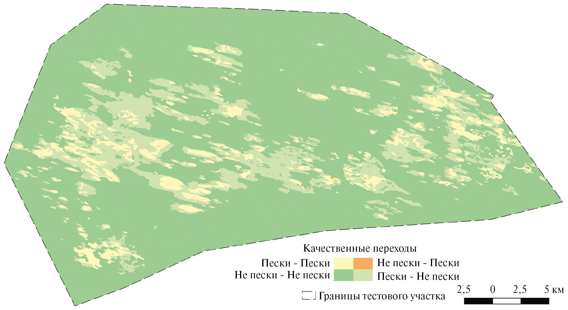 В июне-июле 2023 г. ситуация обратная – прирост площади песков (переход “Не пески – Пески”) зафиксирован на площади 13 га, неизменные площади песков составляют 5.7 тыс. га, тогда как зарастающие пески занимают почти 13 тыс. га. Всего не занятые песками участки составляют более 75% тестового участка.