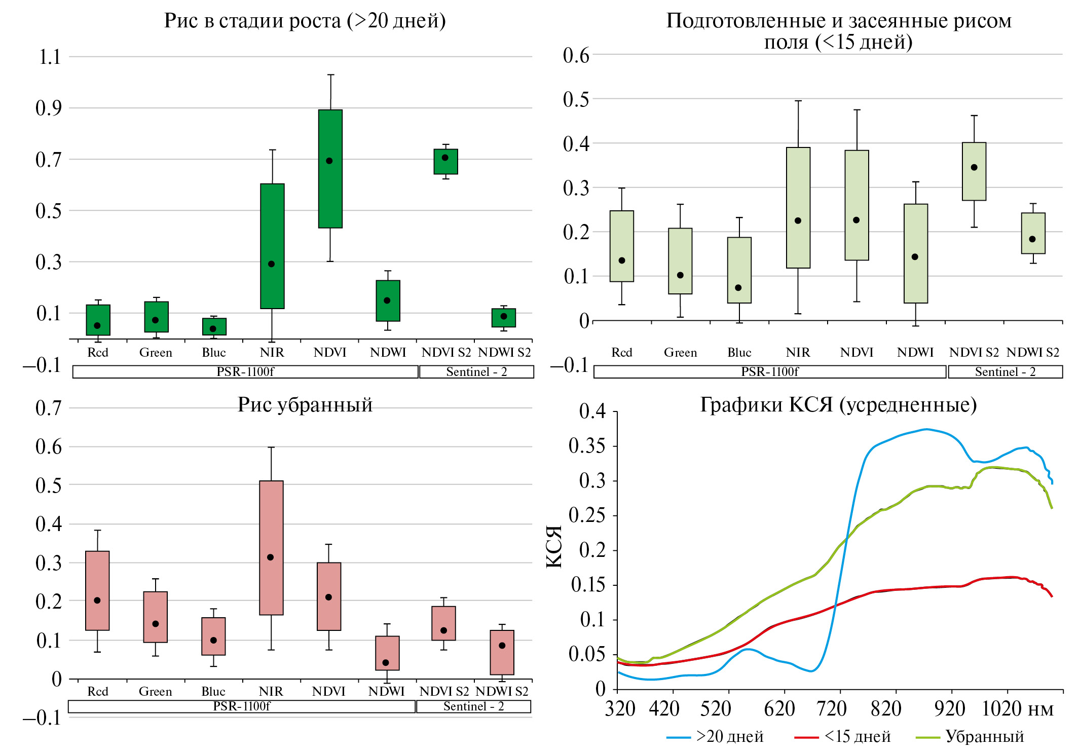 Рис. 1. Поканальные значения КСЯ и значения спектральных индексов рисовых угодий, полученные при наземных и космических исследованиях.