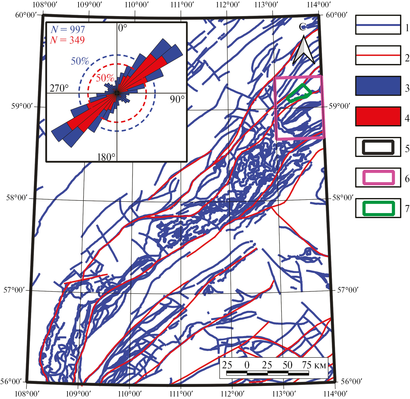 Рис. 5. Схема пространственного распределения разрывных нарушений древнего заложения и неотектонических структур на территории листа ГГК О-49, масштабом 1:1 000 000, и розы-диаграммы их ориентировок: 1, 2 – разрывные нарушения региональные (1) и неотектонические (2); 3, 4 – розы-диаграммы разрывных нарушений древнего заложения (3) и неотектонических зон (4); 5–7 – границы листа ГГК О-49 (5), изучаемой территории (6), перспективного участка Туюкан (7).