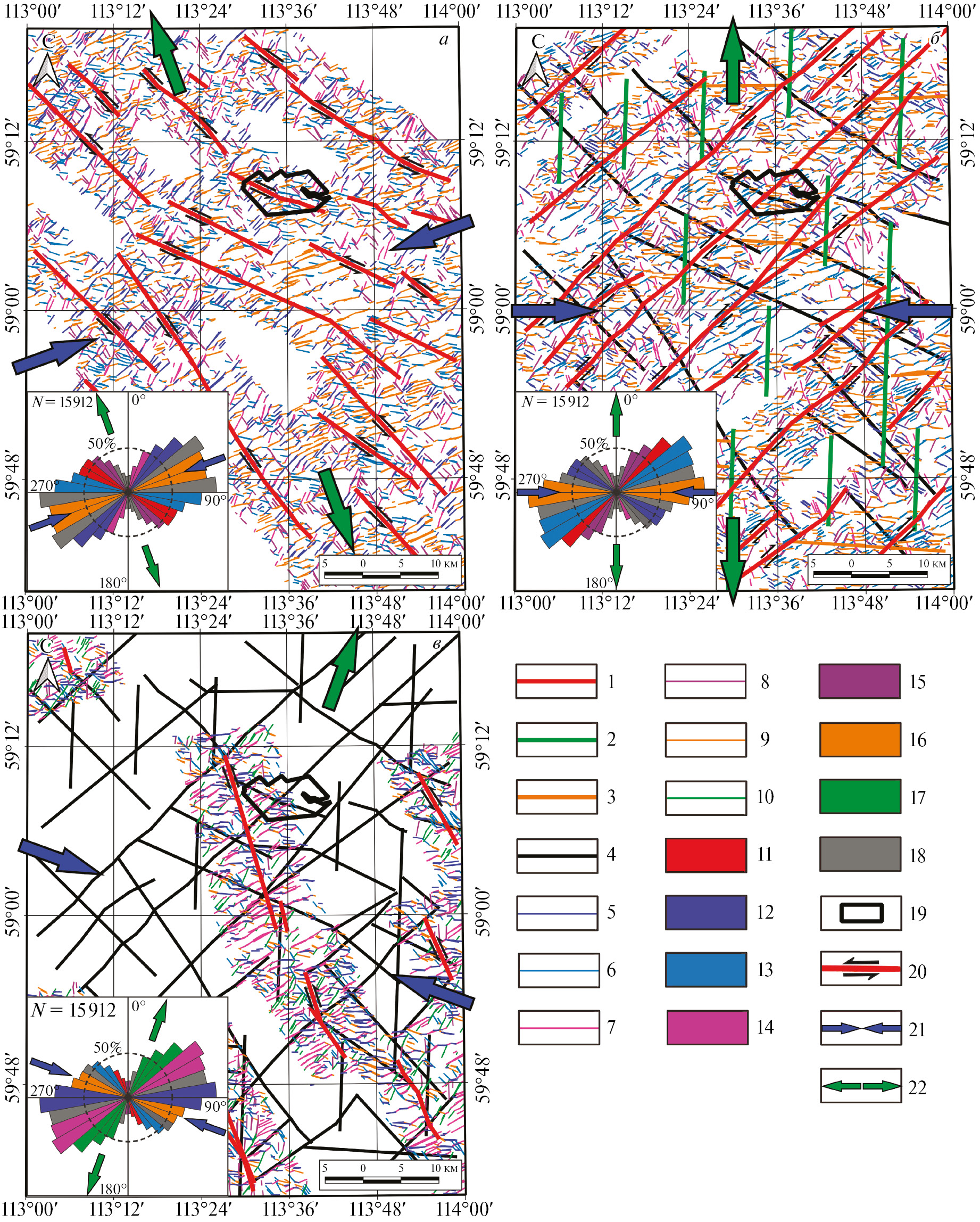 Рис. 10. Реконструкция параметров локальных полей напряжений-деформаций и стадийности формирования каркаса разрывных нарушений района Туюканского рудного узла. а – первая стадия, б – вторая стадия, в – третья стадия. 1 – формируемые на определенной стадии региональные сдвиговые структуры; 2 – региональные взбросы; 3 – региональные отрывы; 4 – сформированные на предыдущих стадиях разрывные структуры; 5 – синтетические сколовые мегатрещины (R’); 6 – антитетические сколовые мегатрещины (R); 7 – вторичные локальные сколы (X); 8 – вторичные локальные сколы (P); 9 – локальные отрывы; 10 – локальные взбросы; 11–18 – ориентировки структур и мегатрещин на розах-диаграммах: магистральные разломы (11), антитетические сколы (12), синтетические сколы (13), вторичные сколы X (14), вторичные сколы P (15), отрывы (16), взбросы (17), структуры других стадий (18); 19 – границы перспективного участка Туюкан; 20 – сдвиговая кинематика структур; 21 – ориентировка оси максимального сжатия; 22 – ориентировка оси максимального растяжения.