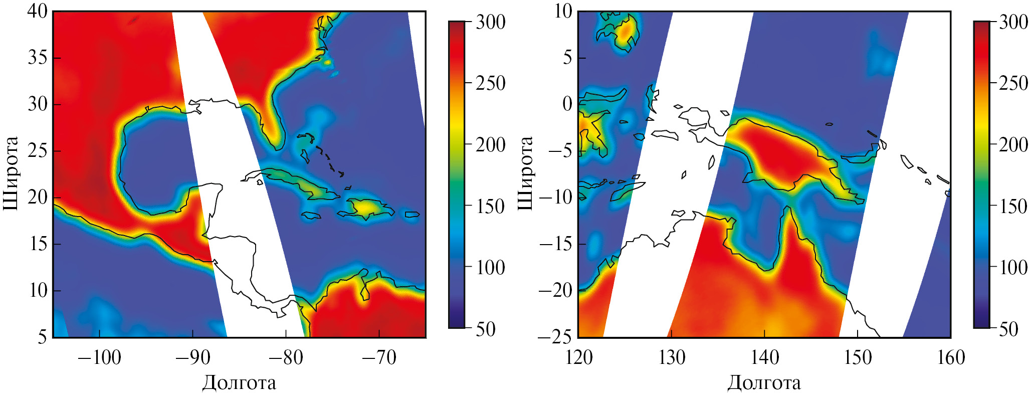 В ходе визуального анализа суточных композитов, сформированных на основе данных МТВЗА-ГЯ, на них были обнаружены ошибки в период с середины апреля по конец мая 2022 года. На рис. 1 приведены характерные для этого периода смещения радиотеплового портрета, формируемого МТВЗА-ГЯ, относительно географических береговых линий. Следует отметить, что географическая привязка данных для всего 2022 года выполнялась в соответствии с алгоритмом, описанным в (Садовский и Сазонов, 2022), и с учетом корректирующих углов, найденных в (Садовский и Сазонов, 2023). При этом для временного интервала, предшествующего указанному периоду, а также более позднему, вплоть до конца года, средние значения ошибок геопривязки не превышали заявленных в (Садовский и Сазонов, 2023) значений в 5 км. Для представленных изображений – смещение составляет более 70 км.