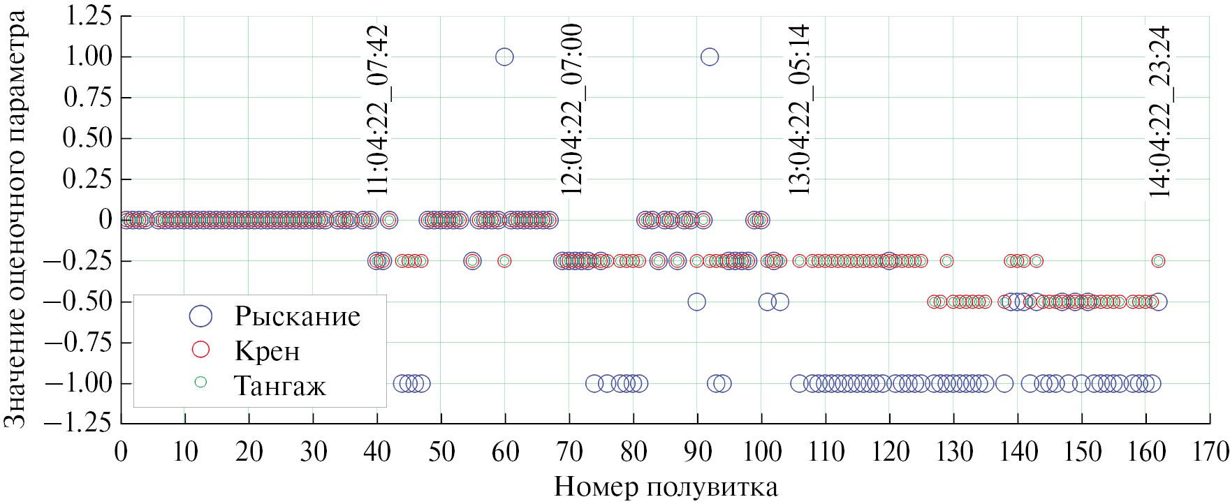 Несмотря на наличие достаточно большого числа неопределенностей визуального подхода, итоговые результаты, представленные на рис. 2, свидетельствуют о возможности его использования на начальных этапах анализа. В частности, с его помощью удалось сделать следующие выводы: до 11 апреля 2022 года проблем с географической привязкой не наблюдалось; в районе 6:00 по московскому времени, были обнаружены первые случаи сбоев в работе МТВЗА-ГЯ; в период 11–13 апреля ошибка пропадала и возникала, частота ее возникновения постепенно увеличивалась; начиная с 5:00 13 апреля по московскому времени ошибка приобрела устойчивый характер; наиболее вероятной причиной наблюдаемых изменений можно принять существенное изменение угла рыскания прибора (в сторону, совпадающую с направлением вращения антенного блока МТВЗА-ГЯ).
