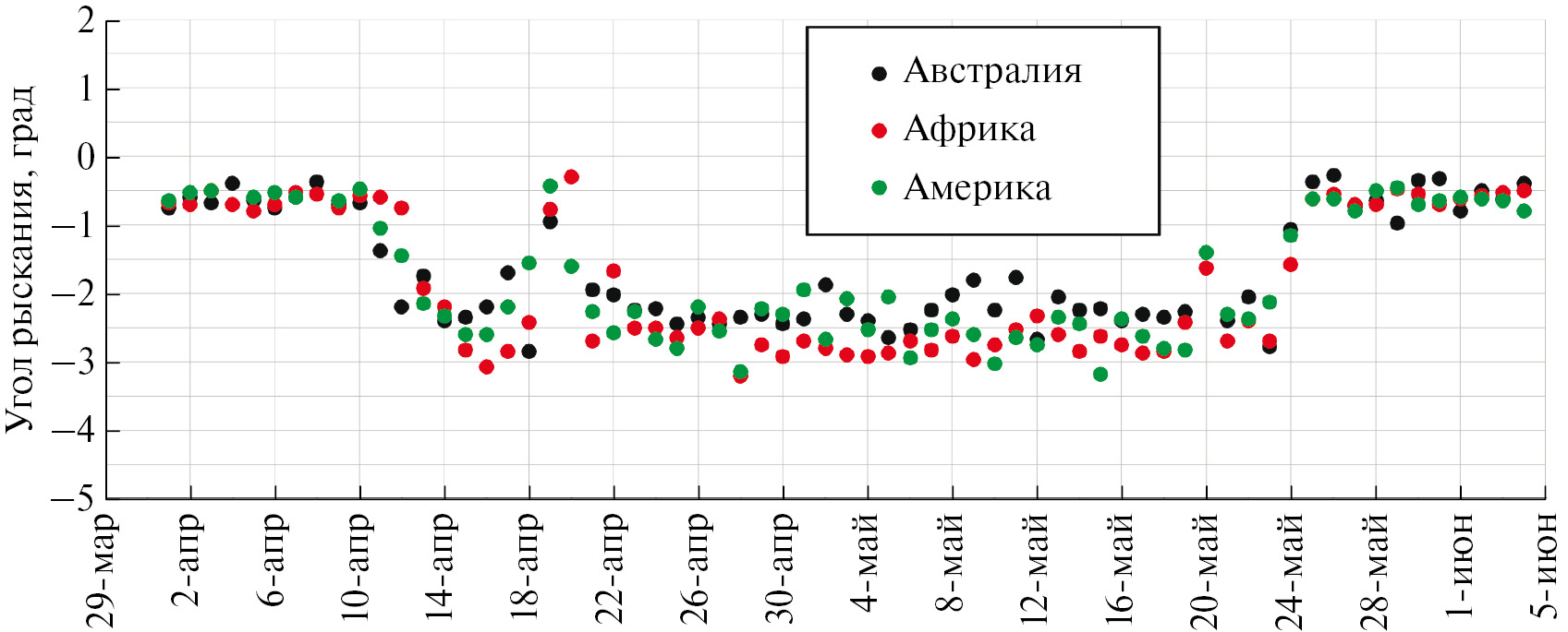 С целью детального изучения характера поведения углов крена, тангажа и рыскания МТВЗА-ГЯ во время сбоя, была проведена операция их посуточного определения в соответствии с методикой, описанной в (Садовский и Сазонов, 2023). Для анализа был выделен период с 1 апреля по 5 мая (когда, судя по визуальному анализу, ошибка геопривязки уже не наблюдалась) 2022 года, чтобы зафиксировать этап возникновения сбоя, отследить его длительность и оценить стабильность наблюдаемых изменений (поскольку одной из вероятных причин предполагалось появление вращения КА в результате плановых корректировок его траектории, или нештатной ситуации).