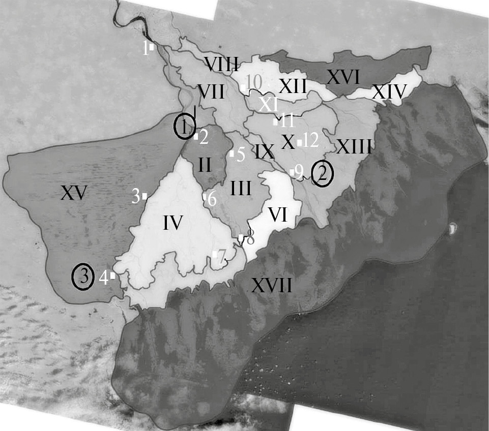 Рис. 3. Районирование дельты Волги, разработанное В.Ф. Полонским (2003). Выполнено на основе космической съемки спутника Landsat-7. I-XVI – номера районов дельты Волги, XVII – отмелая зона устьевого взморья дельты Волги. Белыми прямоугольниками обозначены гидрологические посты. 1–12 – номера гидрологических постов (с. Верхнее Лебяжье (1), г. Астрахань (2), с. Икряное (3), с. Оля (4), с. Килинчи (5), г. Камызяк (6), с. Караульное (7), с. Каралат (8), с. Зеленга (9), с. Красный Яр (10), пос. Володарский (11), с. Большой Могой (12)). В круг обведены номера метеостанций (МС): 1 – МС Астрахань, 2 – МС Зеленга, 3 – МС Лиман.