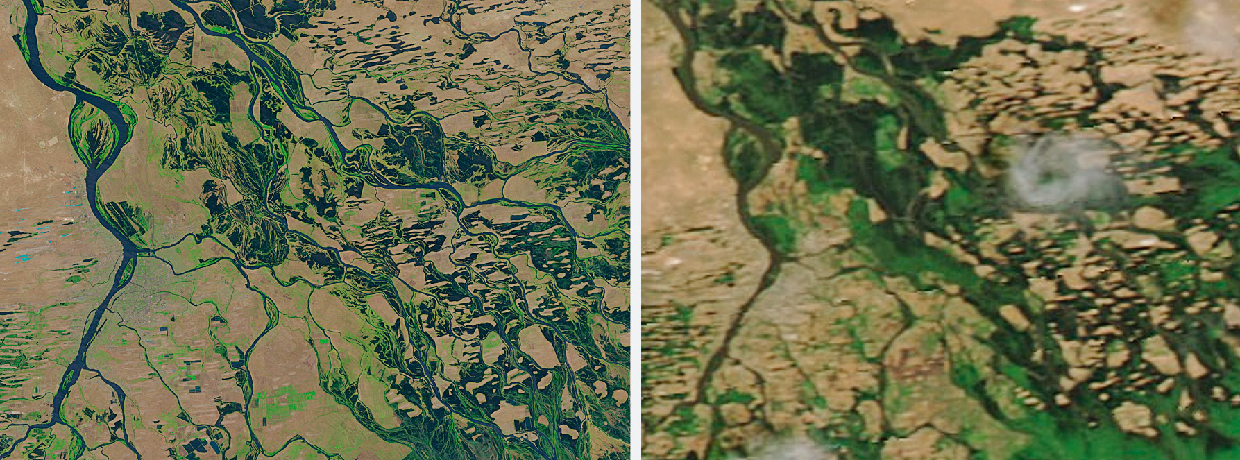Настоящим прорывом в исследованиях площадей заливания ДВ в половодье стало применение космических снимков высокого разрешения (Полонский, Остроумова, 2005). В комбинации спектральных каналов электромагнитного излучения, в которой можно четко различать воду и сушу (Su, 1996; Евдокимов, Михалап, 2015) стало возможно определять Fобщ за даты космической съемки с точностью, которая значительно превосходит точность определения Fобщ по данным авиаоблетов (Su, 1996; Schultz, 1996; Kwang, 2017). На космоснимках высокого разрешения (20 м) российских космических аппаратов (Ресурс-Ф) с применением программы Photoshop В.Ф. Полонский и Л.П. Остроумова (2005) определяли покрытые водой участки в комбинации спектральных каналов “вода/суша” (Su, 1996; Евдокимов, Михалап, 2015). Инструментами программы Photoshop они выделяли пикселы на космоснимках, захваченные водой. Программа рассчитывала количество этих пикселей. Fобщ в пикселах переводилась в Fобщ в км2.