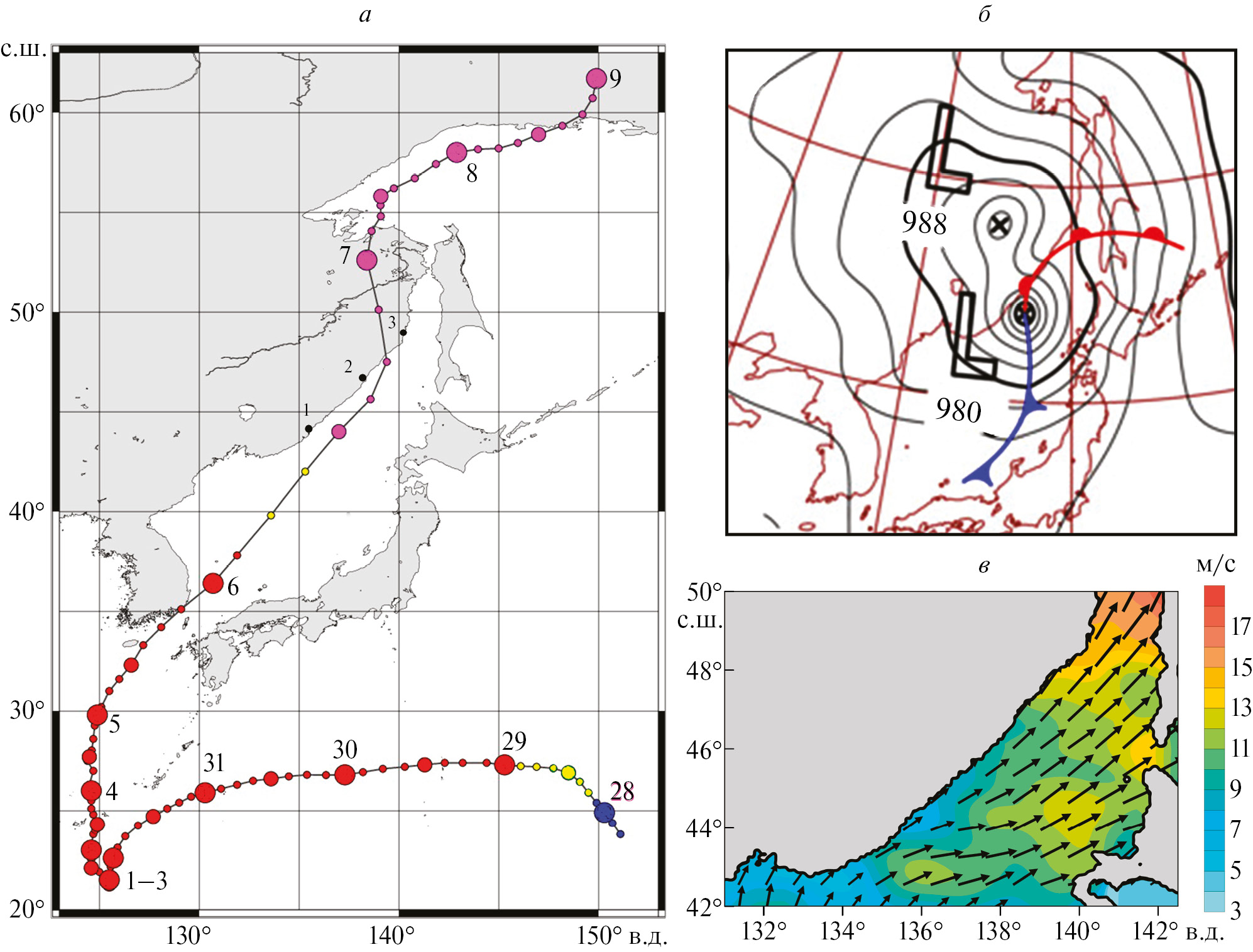 Рис. 1. Траектория движения тайфуна Хиннамнор (а), фрагмент карты приземного синоптического анализа на 12:00 06.09.2022 (б) и распределение направления и скорости приводного ветра в северной части Японского моря по данным NCEI на 12:00 07.09.2022 (в). На рис. 1а цветом выделены стадии развития тайфуна: синий – тропическая депрессия; желтый – тропический шторм; красный – тайфун; фиолетовый – циклон умеренных широт. Цифры у больших кружков на траектории движения тайфуна обозначают даты (00:00) положения центра тайфуна. Черными точками на побережье показаны береговые гидрометеорологические станции: 1 – Ольга; 2 – Сосуново; 3 – Советская гавань.