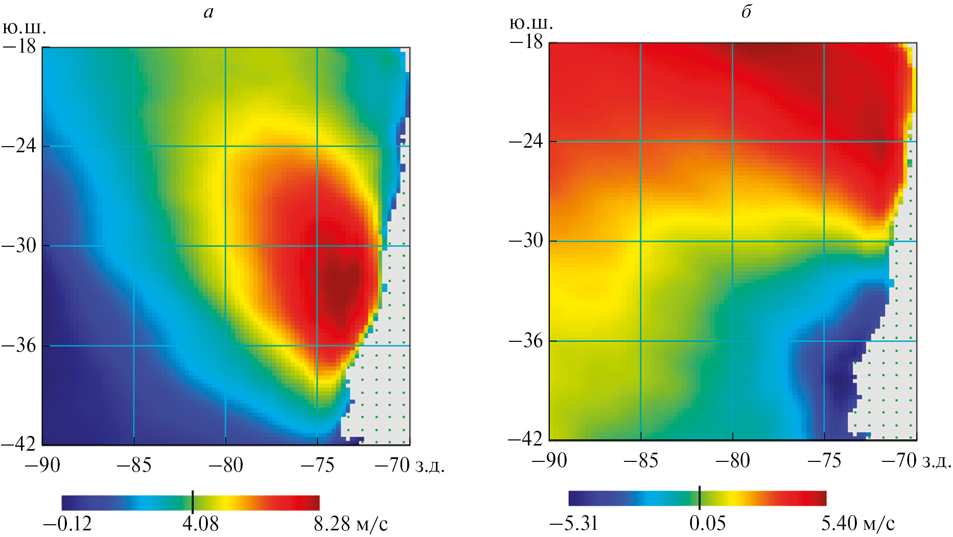 Рис. 1. Среднемесячная меридиональная компонента приповерхностного ветра, рассчитанная по спутниковым данным за январь 2020 г., когда апвеллинг максимально развит в ЮЧА (а) и за июнь 2020 г., когда он наиболее интенсивен в СЧА (б).