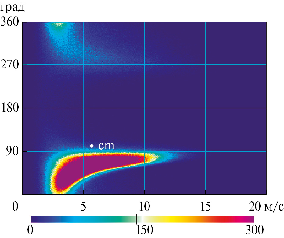 В настоящей работе центры масс рассчитывались для следующих пар взаимных распределений: W и EUI, A и EUI, A и W. В первой из этих пар по оси абсцисс откладывался модуль вектора ПВ, а по оси ординат – индекс экмановского апвеллинга; mi – точка на плоскости с координатами (xi, yi). Соответственно, центр масс распределений расположен в точке mi с координатами (xc, yc). Во второй паре по оси абсцисс откладывается направление вектора ветра и т.д. Распределения рассчитываются для всех точек области предполагаемого апвеллинга на основания анализа среднесуточных векторов ПВ за каждый год и в целом за весь период наблюдений. Для примера на рис. 2 приведено взаимное распределение направления и модуля вектора ПВ для всего ЧА с центром масс в точке (A = 94.6°, W = 5.5 м/с), полученное с использованием спутниковых данных за весь рассматриваемый период времени. Хорошо видно, что центр масс находится выше центра максимальной плотности распределения из-за наличия некоторого количества векторов, характеризующихся направлениями, сильно отличающимися от направления векторов, близких к центру масс. Это связано со значительной пространственно-временной изменчивостью поля ветра в области ЧА.