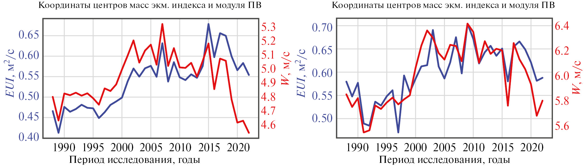 Рис. 3. Межгодовые изменения координат центров масс взаимного распределения экмановского индекса апвеллинга (синяя кривая) и модуля вектора приповерхностного ветра за 1988–2022 гг., построенные по ежегодным данным для СЧА (слева) и ЮЧА (справа).