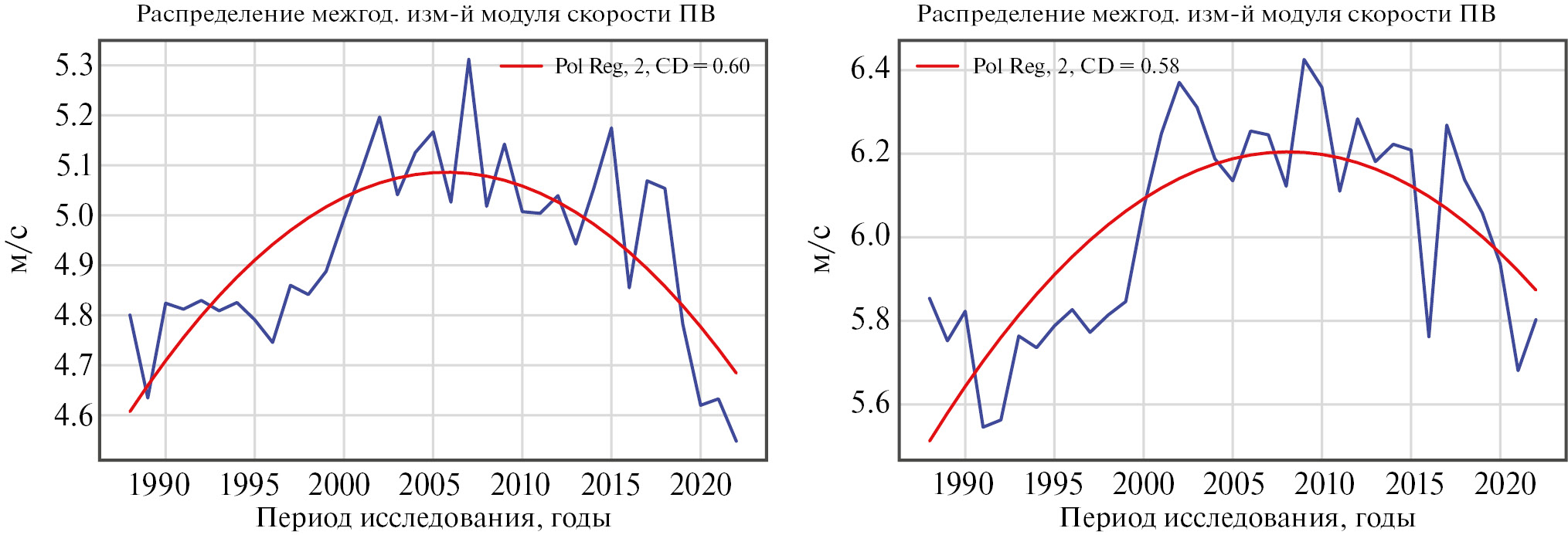 Необходимо отметить следующую особенность долгопериодной изменчивости скорости ветра в области ЧА, хорошо видную на рис. 3 и 4. Она заключается в наличии явно выраженного параболического тренда в скорости ветра, которую можно интерпретировать как проявление квазипериодического сигнала с периодом около 65–70 лет при вдвое меньшей длине анализируемого ряда (Полонский, Воскресенская, 2004). Доказательством реалистичности такой интерпретации служат результаты работы (Аверьянова, Полонский, 2024), в которой показано, что Атлантическая мультидекадная осцилляция с типичным периодом около 65 лет наиболее явно проявляется в потоках тепла на нижней границе атмосферы в западной части Южной Америки, примыкающей к области ЧА. Аналогичная долгопериодная изменчивость выделяется во временном ходе экмановского индекса апвеллинга и скорости ветра как в СЧА, так и в ЮЧА (рис. 3, 4).