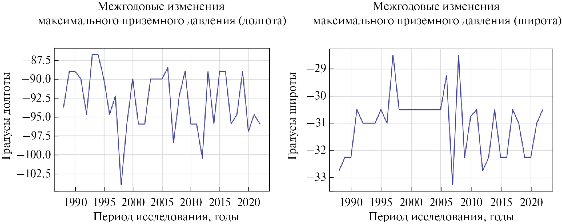 Рис. 7. Межгодовые изменения долготы (слева) и широты (справа) субтропического максимума давления в юго-восточной части Тихого океана.