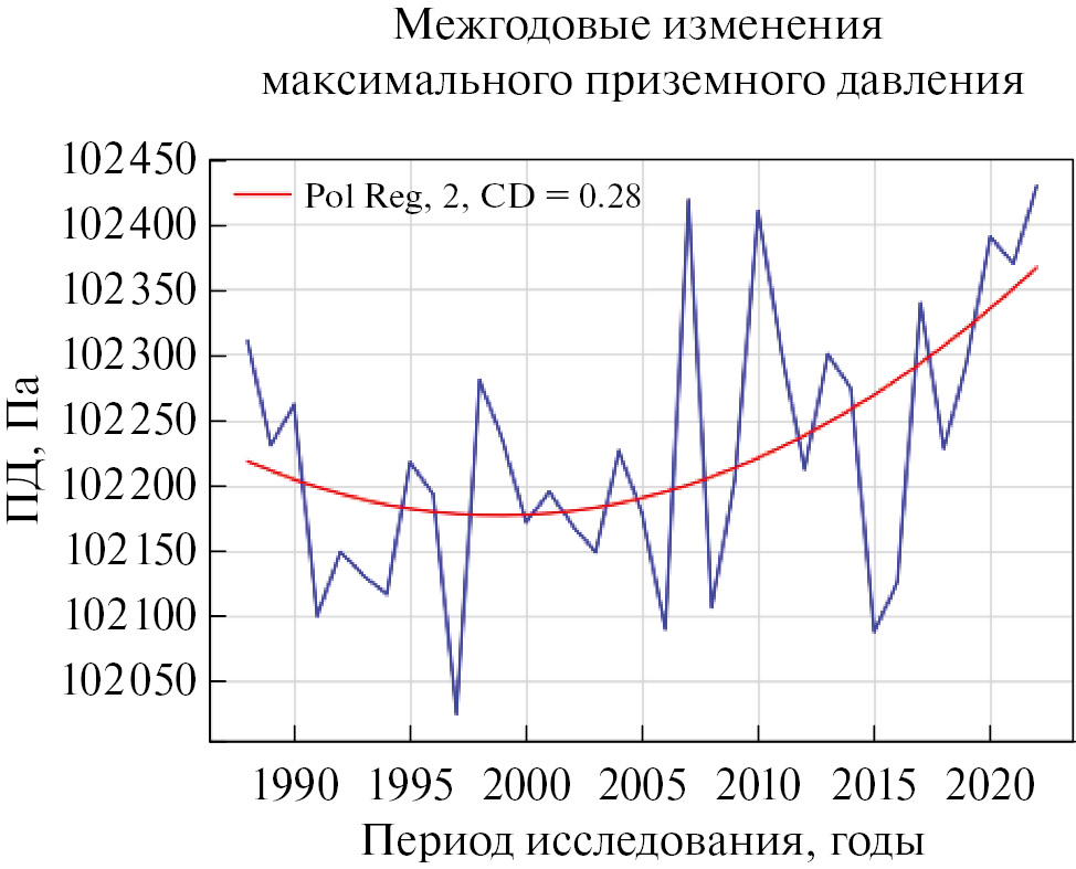 Рис. 8. Межгодовые изменения среднегодового приземного давления в субтропическом максимуме юго-восточной части Тихого океана. Координаты исследуемого района: –120° … –70° з.д. и –52° … –18° ю.ш. Период: 1988–2022 гг. Красным цветом показан параболический аппроксимирующий полином. CD – коэффициент детерминации этого полинома.
