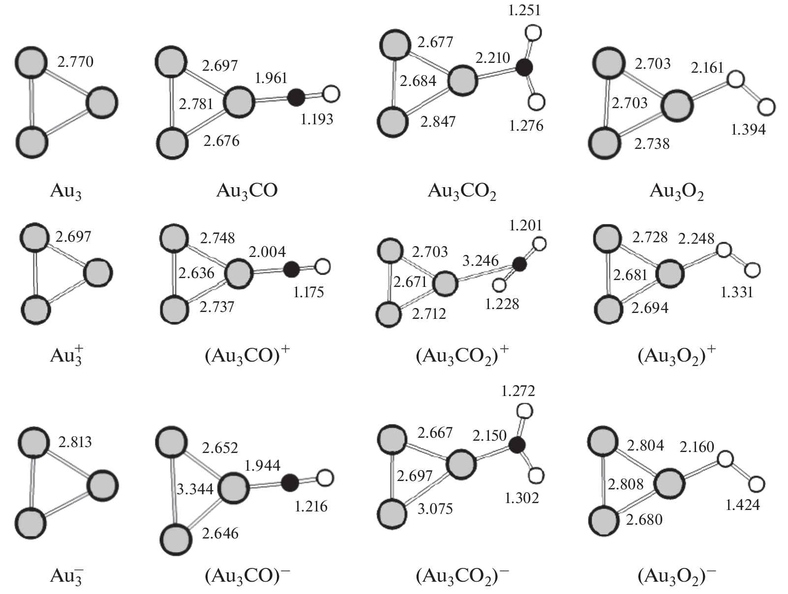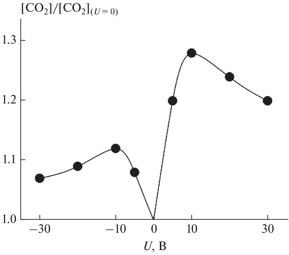Measurements are reported of the increase in catalytic CO oxidation rate on gold nanocoatings obtained by applying a positive or negative electrical voltage of variable magnitude to a coating. In experiments on an initial mixture of 1.8% СО + 10.2% О2 + Ar and a coating with a starting particle size of 0.2 to 3 nm, conducted at 430°C and atmospheric pressure, the extent of the CO oxidation rate enhancement caused by a stepwise increase in the applied positive voltage initially amounts to 28% at +10 V and then declines to 20% at +30 V. Applying a negative voltage has a weaker effect: after an initial increase by 12% at –10 V, the extent of the enhancement of the CO oxidation rate declines to 7% at –30 V. Quantum chemical calculations are performed to determine the heats of association for CO and O2 with the simplest electrically neutral or electrically charged Au3 cluster, as well as the heats of the reaction for Au3CO + O → Au3CO2 and Au3CO2 → Au3 + CO2 involving differently charged Au3 complexes. Based on the calculated results, an explanation is proposed for the increased catalytic CO oxidation rate on electrically charged gold nanocoatings.