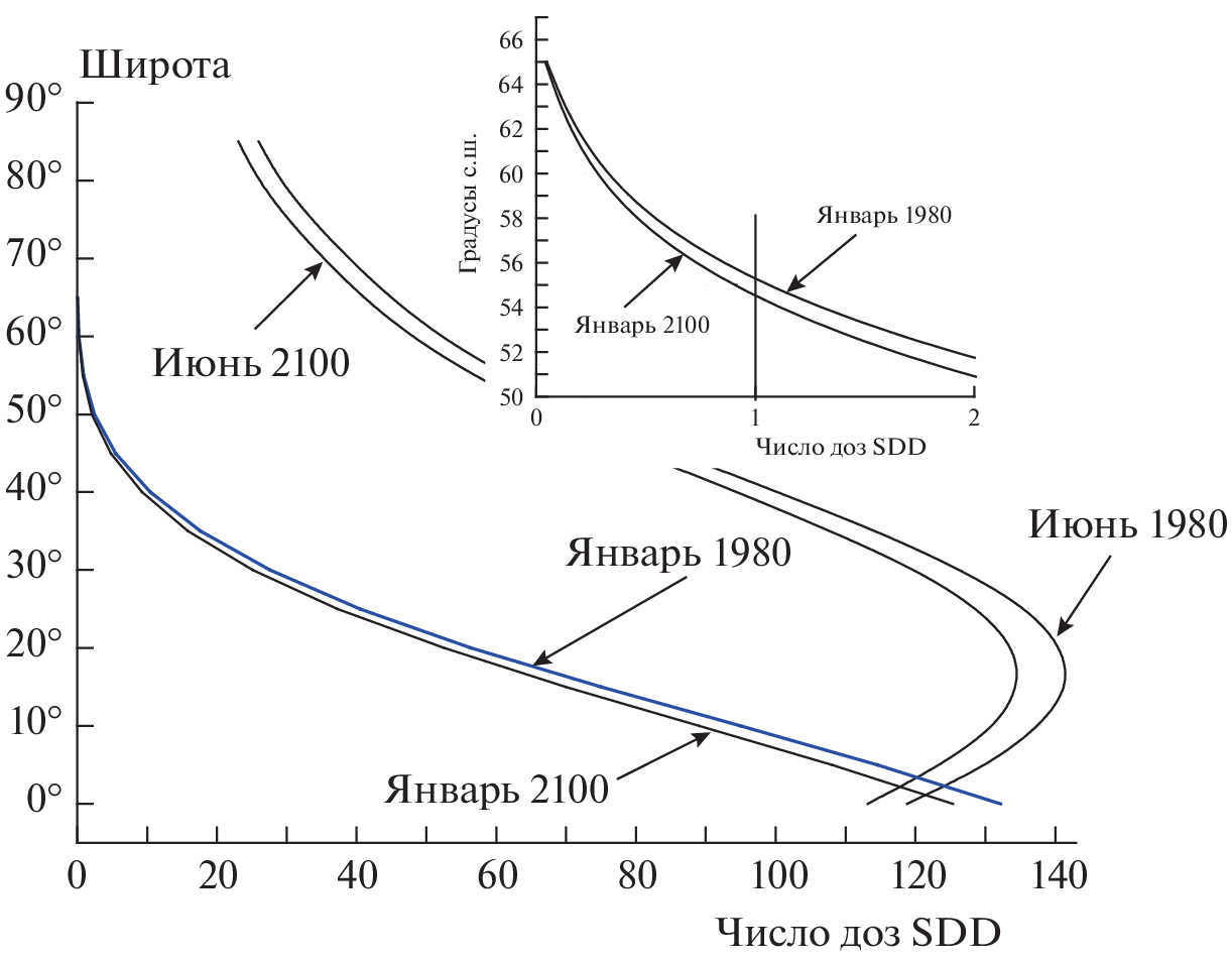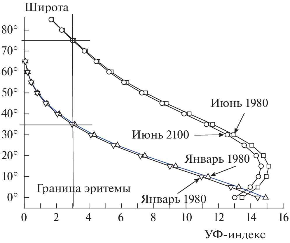 Представлены данные о содержании озона в июне и январе 1980 и 2100 годов, полученные с помощью двумерной интерактивной модели средней атмосферы SOCRATES. На основании этих данных с помощью программы “Fast simulation of downward UV doses, indices and irradiances at the Earth’s surface”, разработанной в Норвежском институте атмосферных исследований, рассчитано изменение основных факторов биологически активной солнечной радиации к концу 21-го века, включая данные, связанные с образованием эритемы и витамина D у человека. Показано, что параметры биологически активной радиации к концу 21-го века могут измениться по сравнению с 1980-м годом, однако это не создаст существенной угрозы для здоровья человека.
