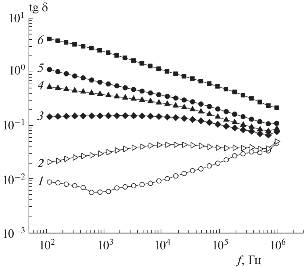 0.1 kHz–1 MHz (the maximum values are noted at a 50 vol % of the filler and f = 102 Hz: ε = 518, tanδ = 4,