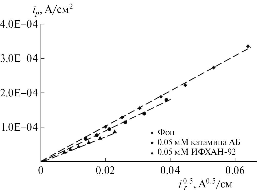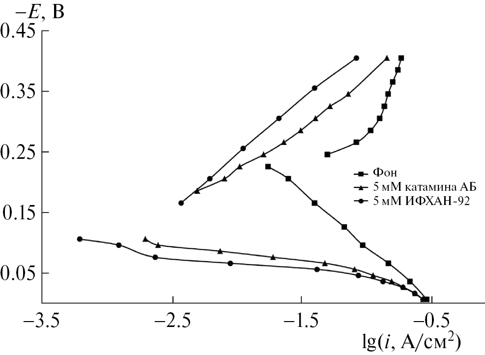Как видно из (рис. 8), присутствие ИК в 2М растворе H2SO4 тормозит скорости как катодной, так и анодной реакции на пружинной стали. Добавки катамина АБ и ИФХАН-92 снижают скорость анодной ионизации стали, например при E = –0.10 B в 42 и 130 раз соответственно. Скорость катодной реакции при E = –0.30 B уменьшается в присутствии этих ИК в 3.1 и 5.9 раз. Видно, что при прочих равных условиях влияние ИФХАН-92 на электродные реакции пружинной стали существеннее, чем для катамина АБ. Как следствие, массопотеря образцов стали в растворах H2SO4, содержащих ИФХАН-92 минимальна, что отмечается в п. 3.4.