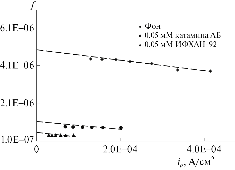 Исследования адсорбции ИФХАН-92 проводили методом СЭИ с использованием потенциостата IPC Pro MF, совмещенного с анализатором частотного отклика FRA, на вращающемся (1000 об/мин) дисковом электроде из низкоуглеродистой стали рабочей площадью 0.64 см2. Перед опытом электрод зачищали на абразивных кругах разной зернистости, полировали алмазной пастой АСМ 0.5/0 и обезжиривали ацетоном. Для предотвращения растворения стального электрода он всегда находился при катодной поляризации (E = –0.30 В). Измерения проводили в трехэлектродной ячейке. В качестве электрода сравнения использовали хлоридсеребряный, в качестве вспомогательного — платиновый. Электрохимический импеданс стального электрода измеряли в диапазоне частот 10 мГц — 3 кГц с амплитудой переменного напряжения 0.020 В. Обработку результатов измерений импеданса проводили по программе Dummy Circuits Solver, Version 1.7. Стальной электрод помещали в раствор кислоты и выдерживали его до установления стационарного спектра импеданса (не более 2 ч), после чего вводили в раствор необходимую концентрацию ИК, Cinh, и выдерживали электрод до получения стационарного спектра (не более 3 ч). Опыты проводили в деаэрированных аргоном 2 M растворах H2SO4 при t = (22 ± 1) °C.