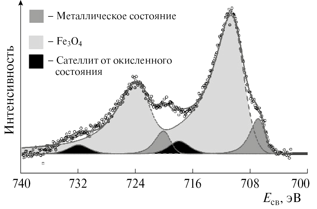 Рис. 9. Стандартный РФЭ-спектр электронов Fe(2p3/2) (спин орбитальное расщепление — дуплет) поверхности низкоуглеродистой стали после предварительной адсорбции ИК (2 M H2SO4 + 5 мМ ИФХАН-92, 25 °С, 24 ч).